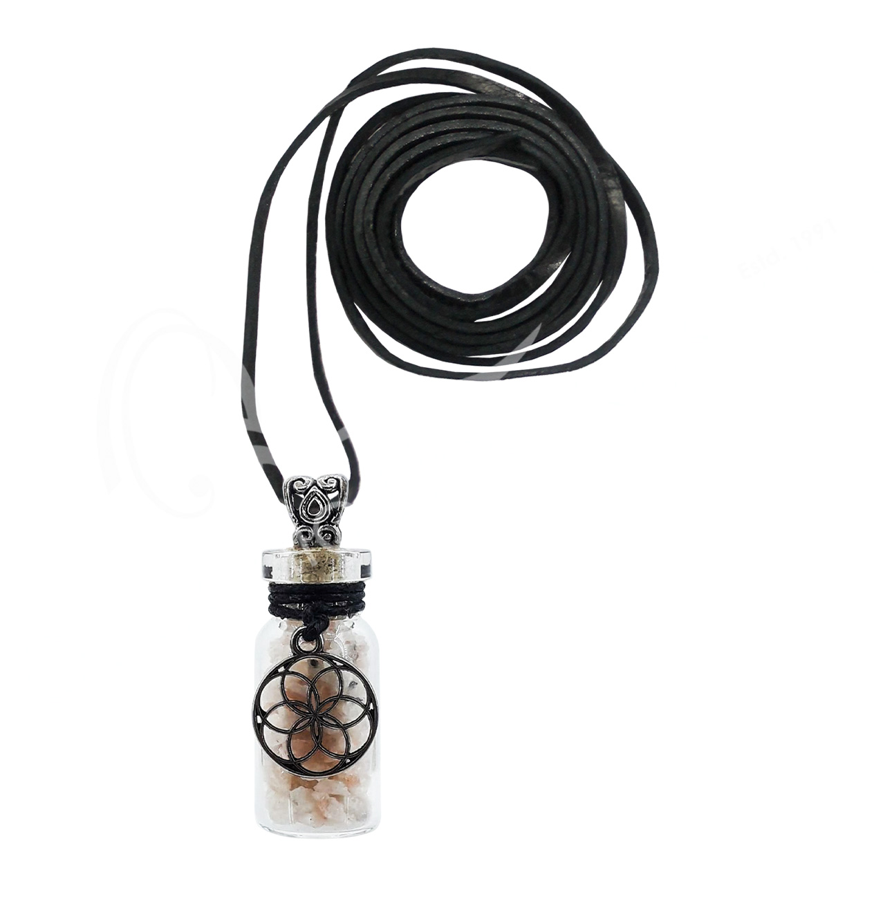 NECKLACE – CHIPS STONES IN BOTTLE SUNSTONE WITH SEED OF LIFE 1.5″H