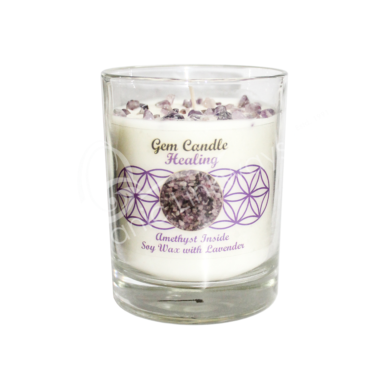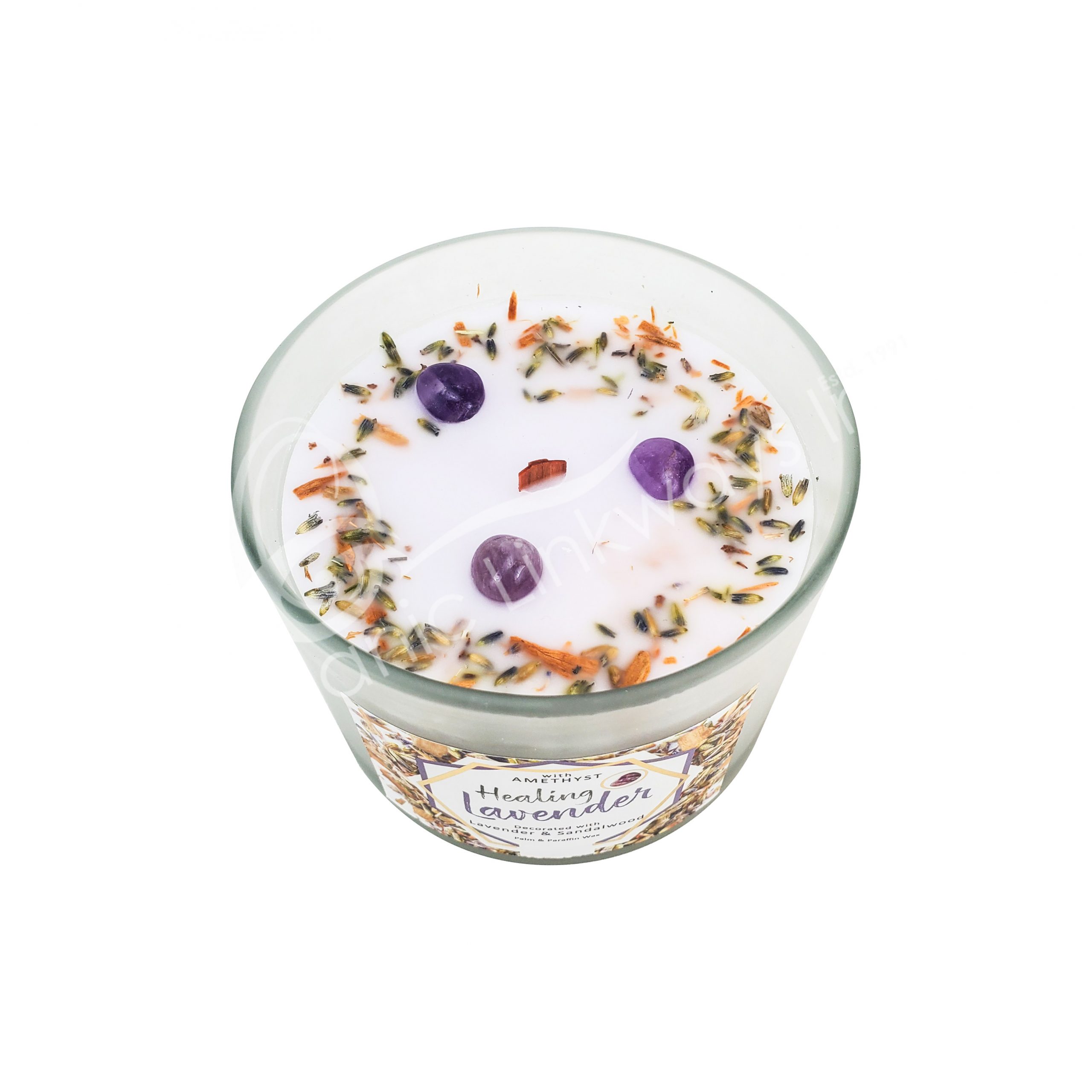 CANDLE – SOY WAX LAVENDER WITH AMETHYST/HEALING 4″H X 3.25″DIA.