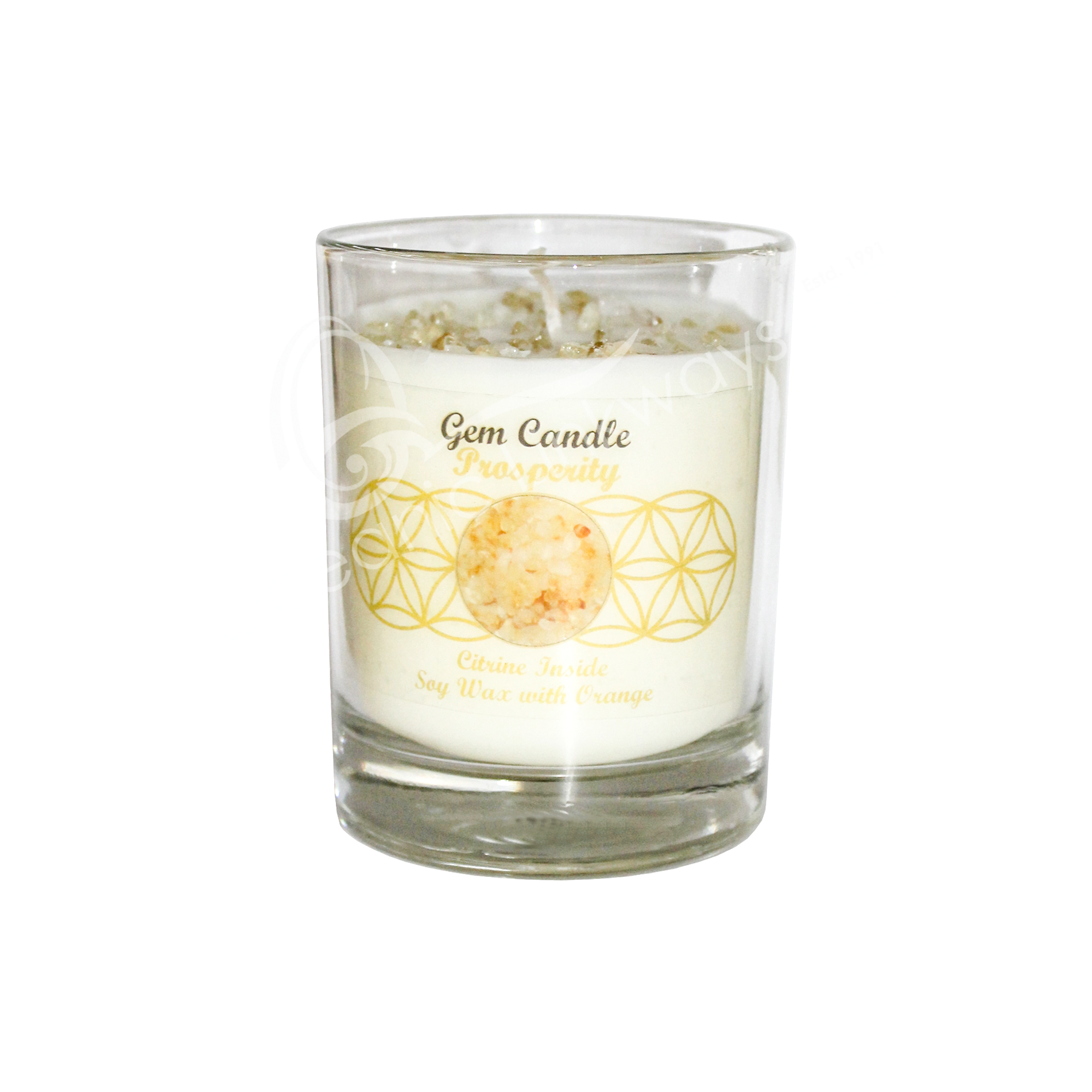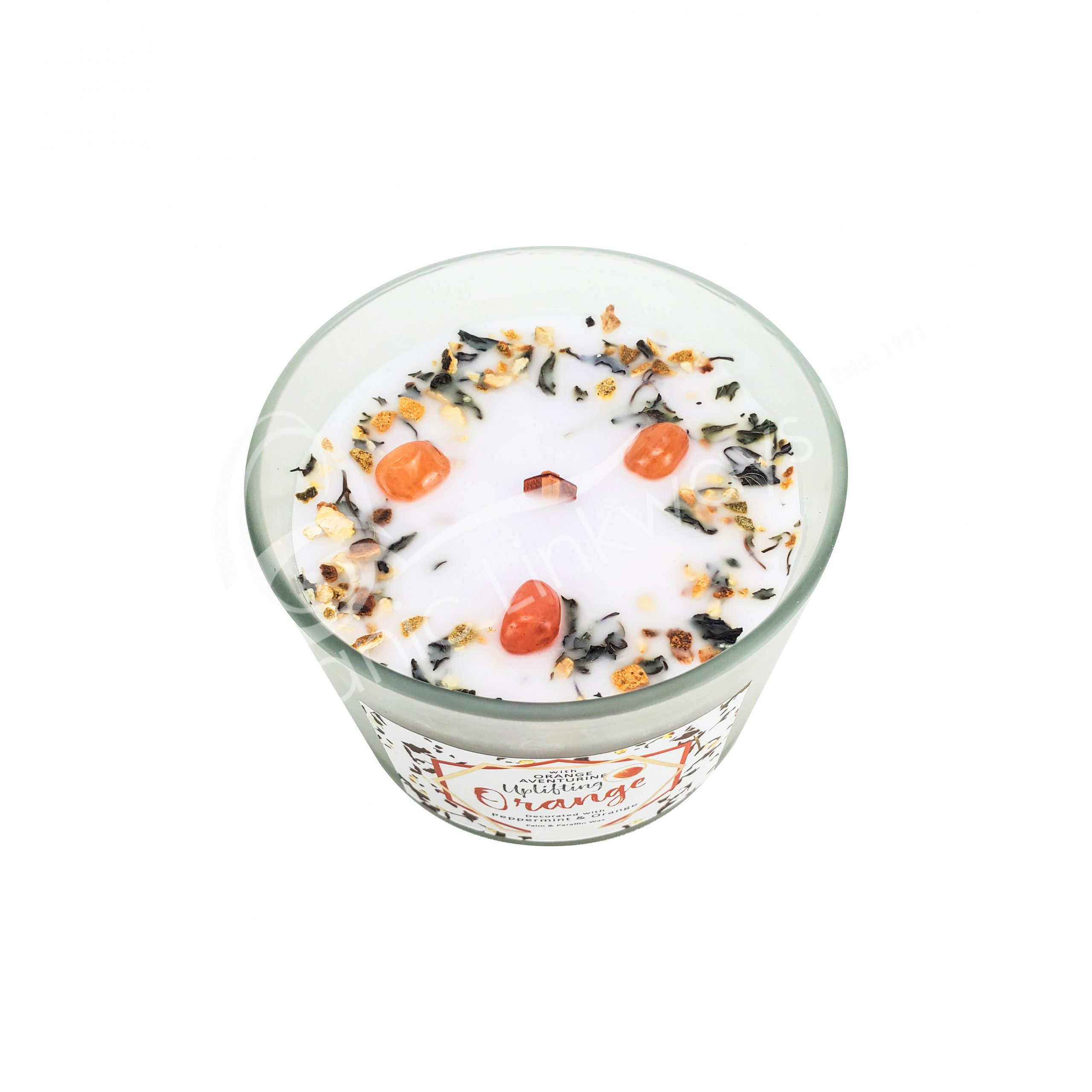 CANDLE – SOY WAX ORANGE WITH CITRINE/PROSPERITY 4″H X 3.25″DIA.