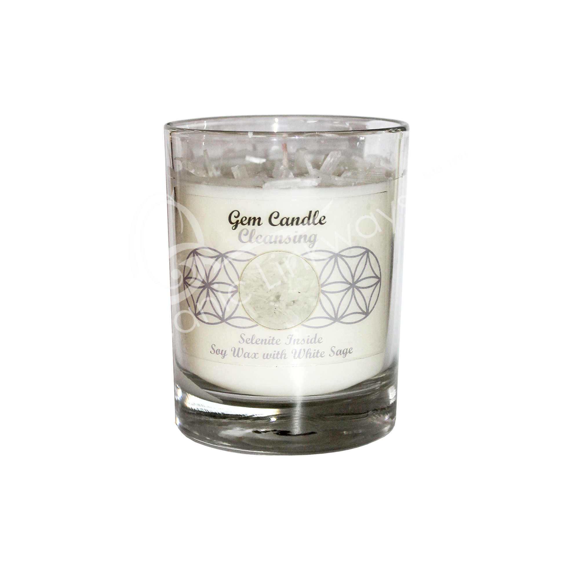 CANDLE – SOY WAX SAGE WITH SELENITE/CLEANSING 4″H X 3.25″DIA.
