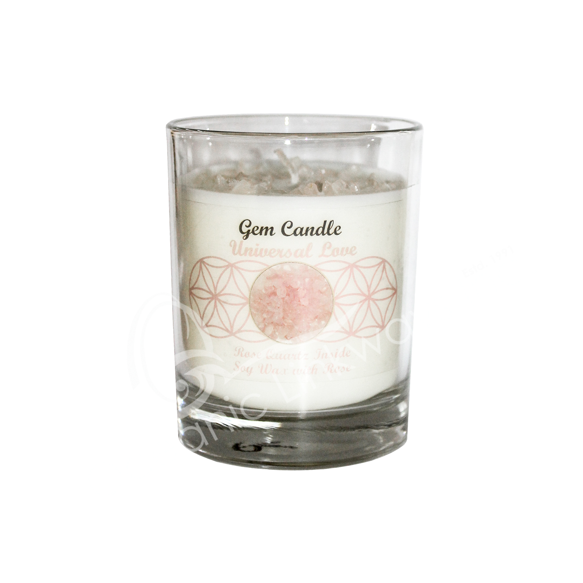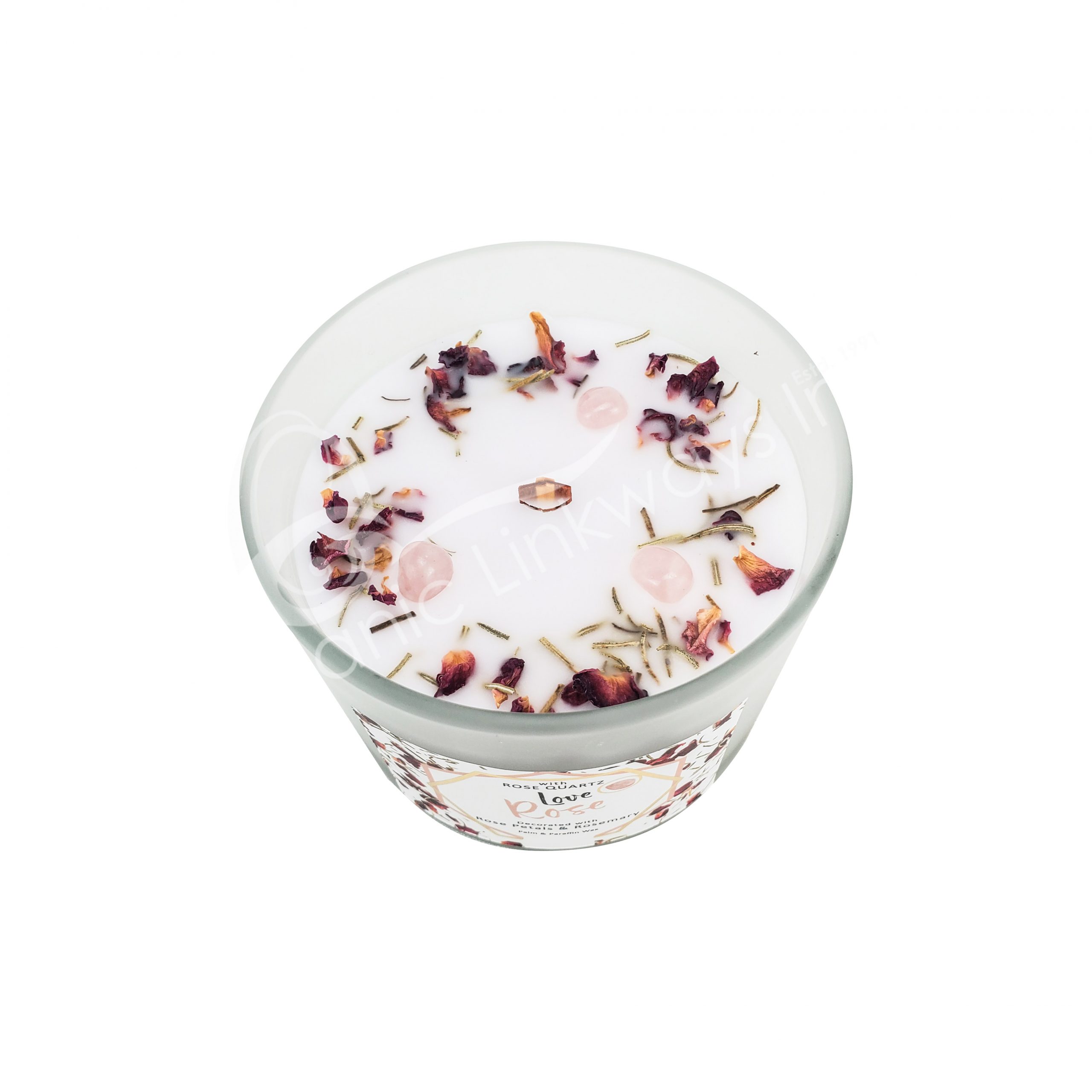 CANDLE – SOY WAX ROSE WITH ROSE QUARTZ/UNIVERSAL LOVE 4″H X 3.25″DIA.