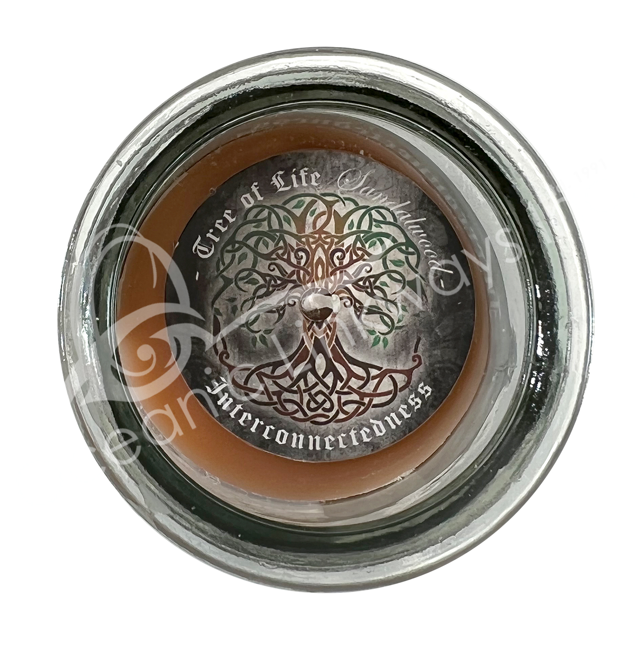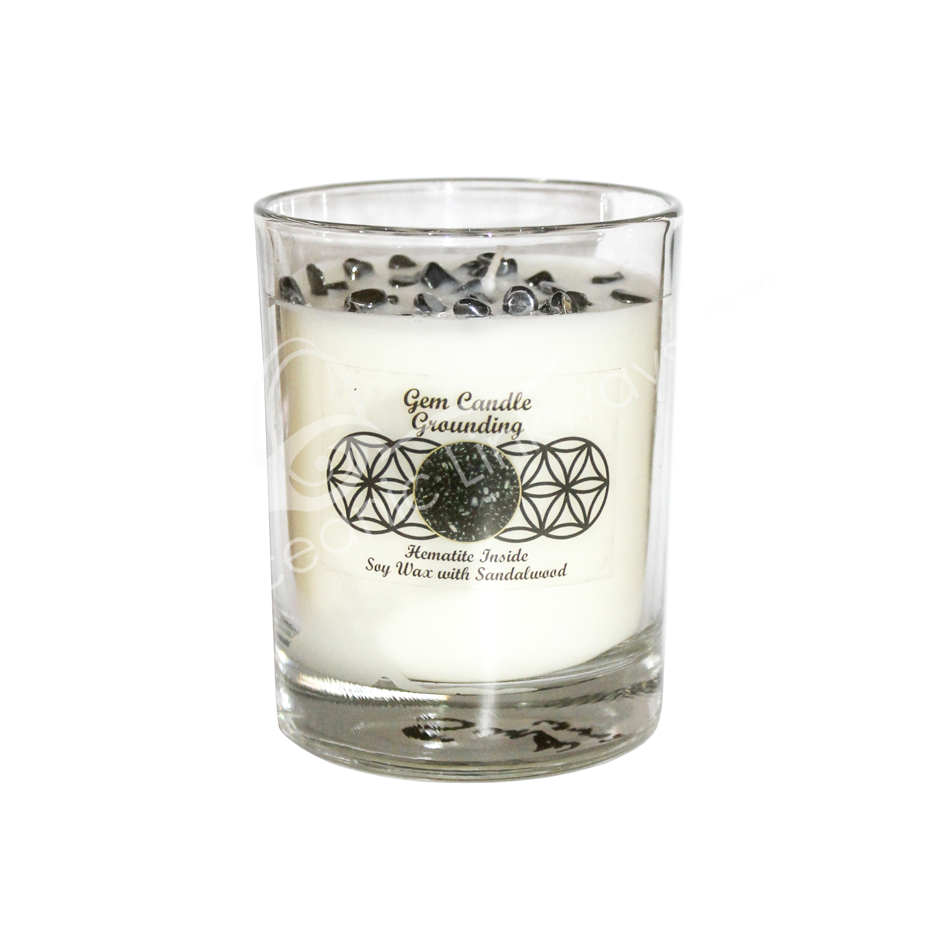 CANDLE – SOY WAX SANDALWOOD WITH HEMATITE/GROUNDING 4″H X 3.25″DIA.