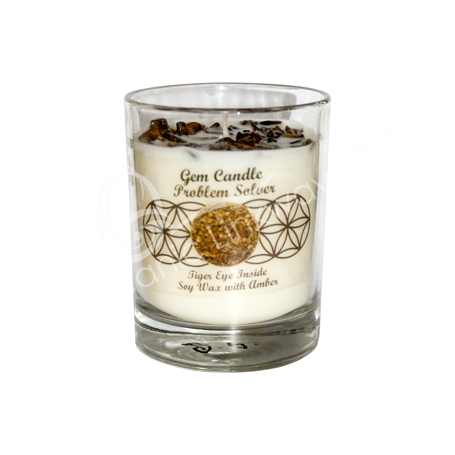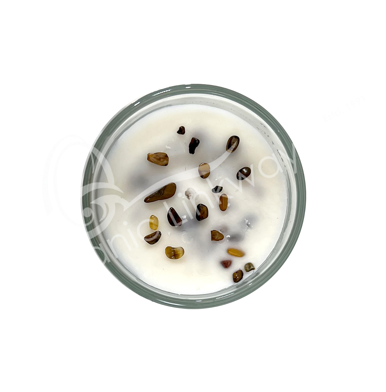 CANDLE – SOY WAX AMBER WITH TIGER EYE/PROBLEM SOLVER 4″H X 3.25″DIA.