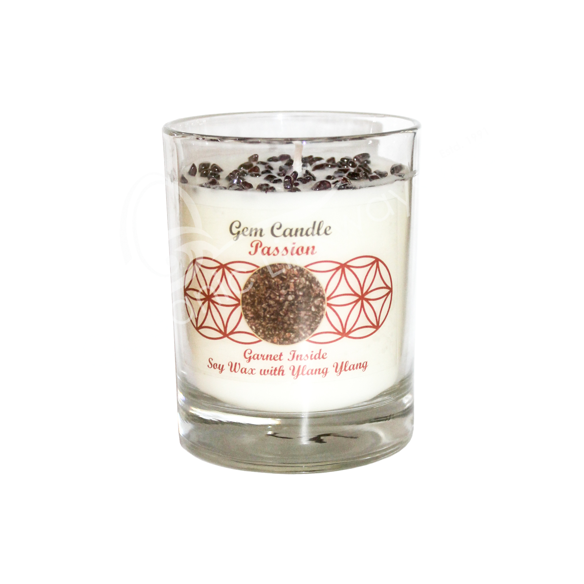 CANDLE – SOY WAX YLANG YLANG WITH GARNET/PASSION 4″H X 3.25″DIA.