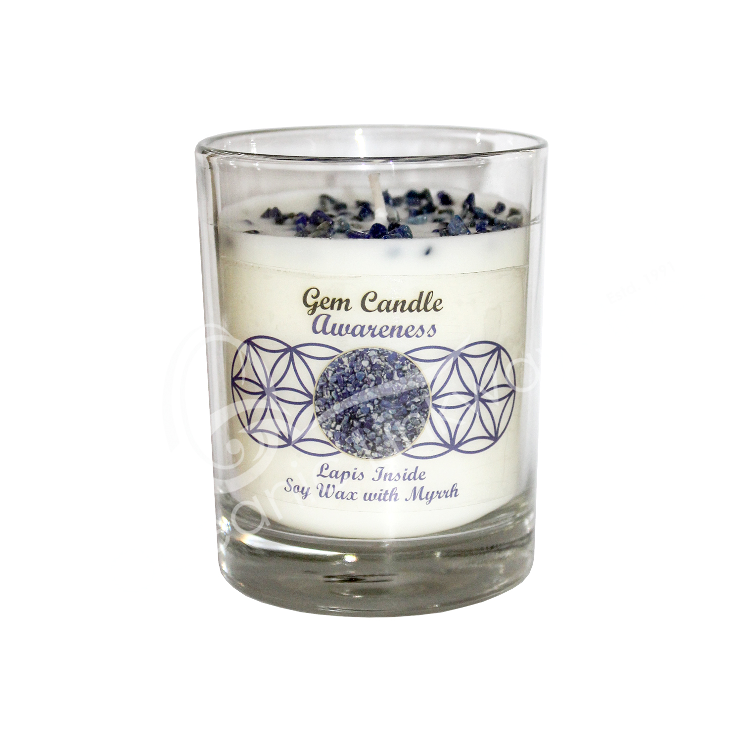 CANDLE – SOY WAX MYRRH WITH LAPIS LAZULI/AWARENESS 4″H X 3.25″DIA.