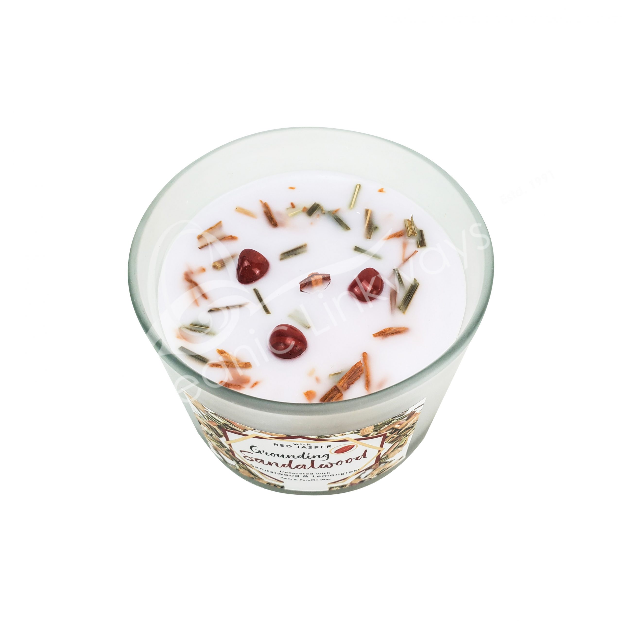 CANDLE – AROMATHERAPY SANDALWOOD/GROUNDING WITH RED JASPER 3″H X 3.25″DIA