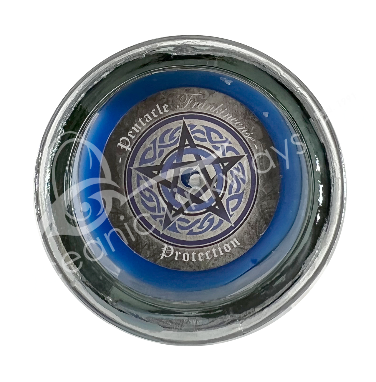 CANDLE – GLASS JAR FRANKINCENSE/PENTACLE 8″H X 2.25″DIA.
