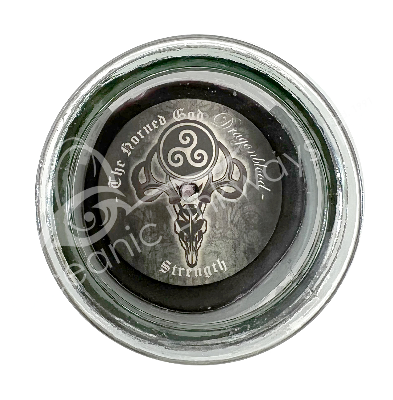 CANDLE – GLASS JAR DRAGONBLOOD/THE HORNED GOD 8″H X 2.25″DIA.