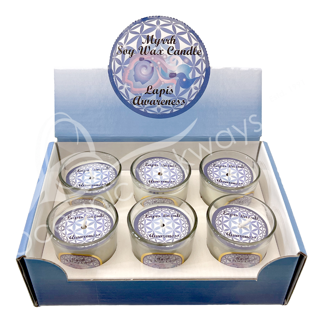 CANDLE VOTIVE – SOY WAX MYRRH WITH LAPIS LAZULI/AWARENESS (PK 6) 2.25-2.5″H X 2.25″DIA.