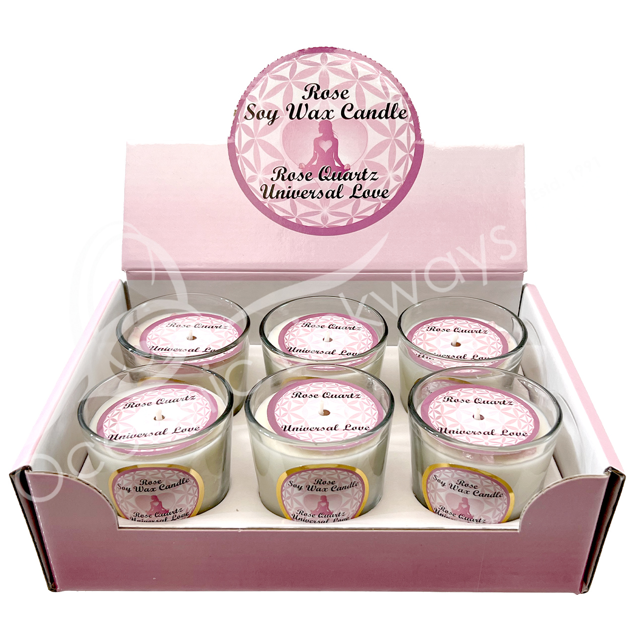 CANDLE VOTIVE – SOY WAX ROSE WITH ROSE QUARTZ/UNIVERSAL LOVE (PK 6) 2.25-2.5″H X 2.25″DIA.
