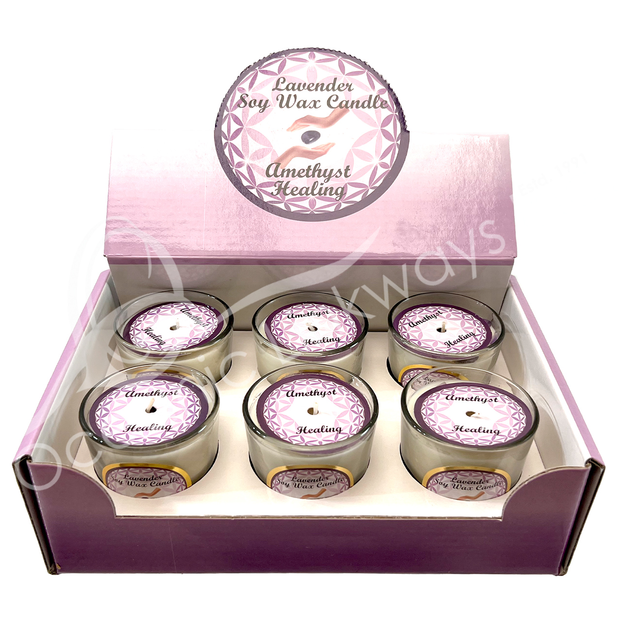 CANDLE VOTIVE – SOY WAX LAVENDER WITH AMETHYST/HEALING (PK 6) 2.25-2.5″H X 2.25″DIA.
