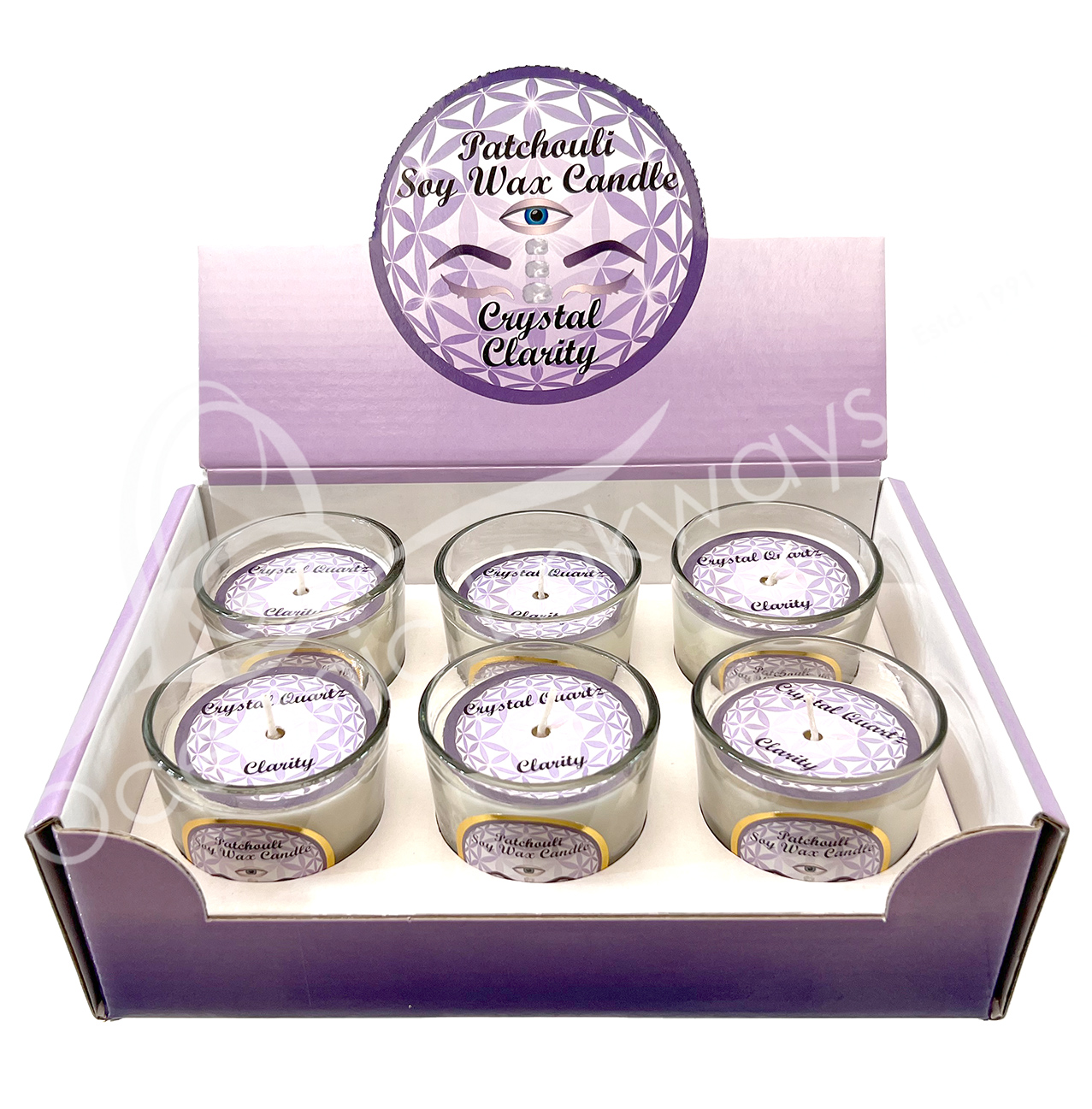 CANDLE VOTIVE – SOY WAX PATCHOULI WITH CRYSTAL QUARTZ/CLARITY (PK 6) 2.25-2.5″H X 2.25″DIA.