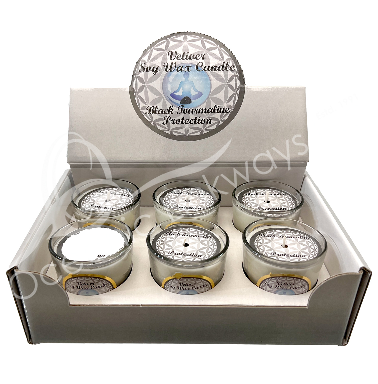 CANDLE VOTIVE – SOY WAX VETIVER WITH BLACK TOURMALINE/PROTECTION (PK 6) 2.25-2.5″H X 2.25″DIA.