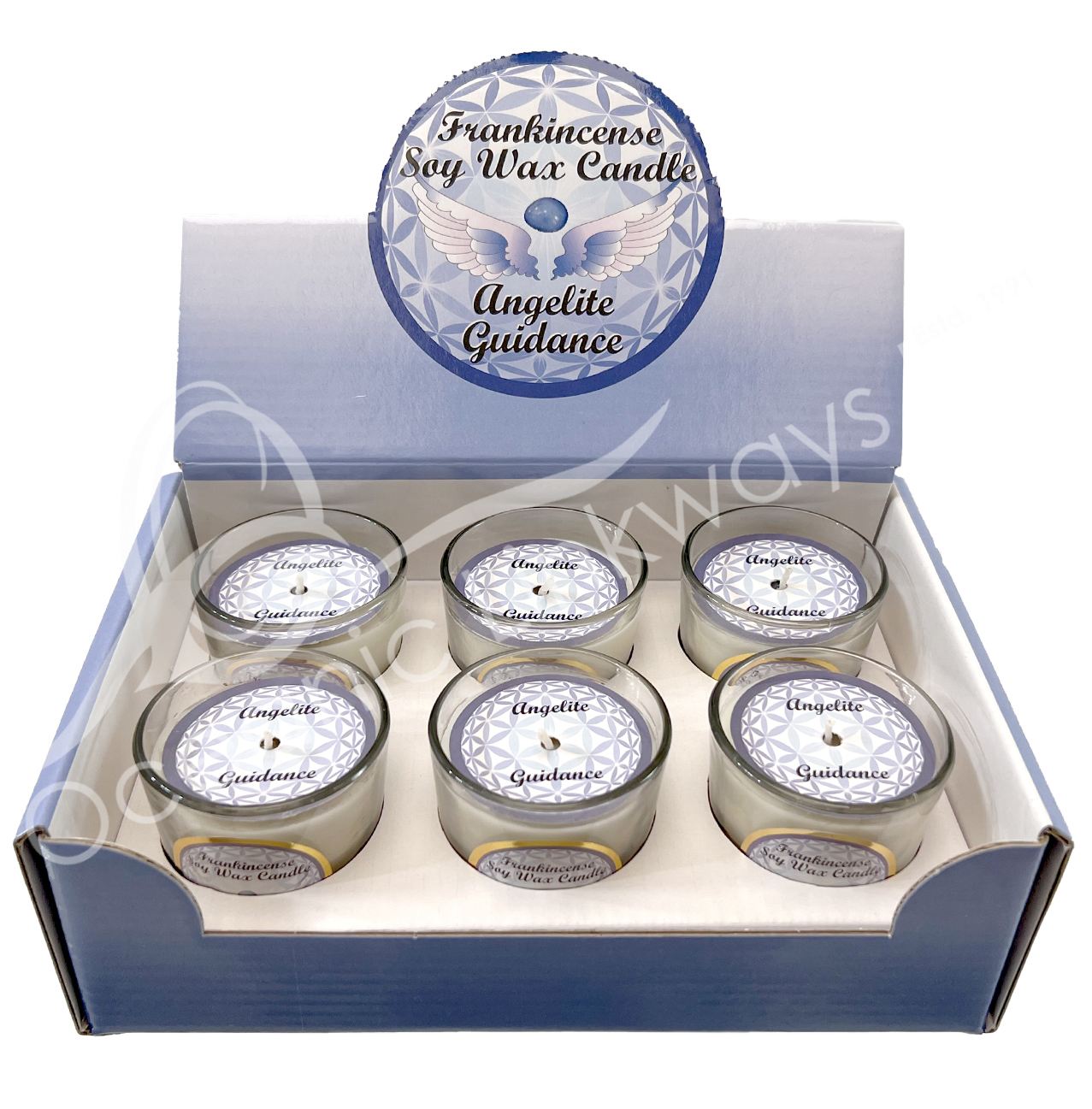 CANDLE VOTIVE – SOY WAX FRANKINCENSE WITH ANGELITE/GUIDANCE (PK 6) 2.25-2.5″H X 2.25″DIA.