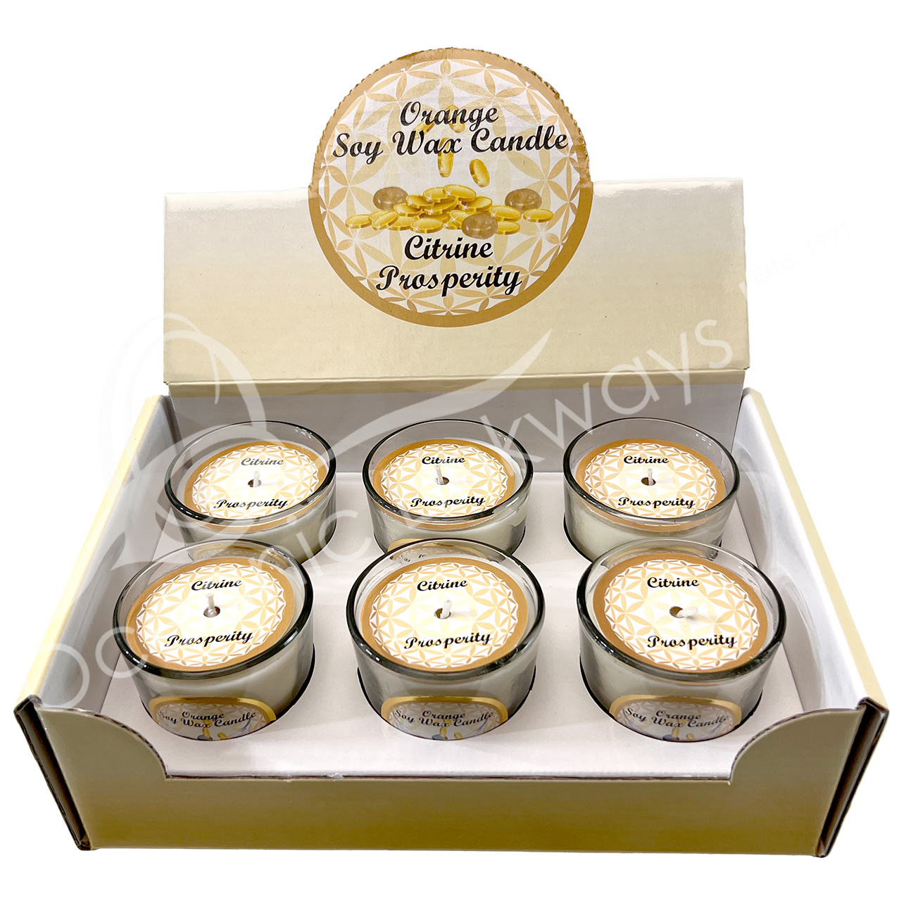 CANDLE VOTIVE – SOY WAX ORANGE WITH CITRINE/PROSPERITY (PK 6) 2.25-2.5″H X 2.25″DIA.