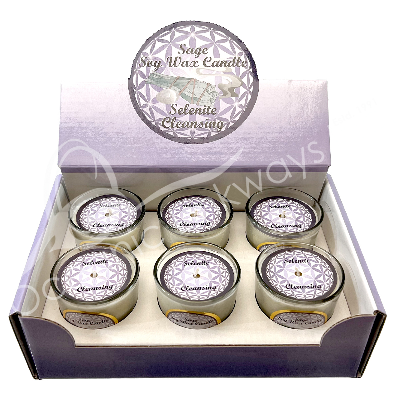 CANDLE VOTIVE – SOY WAX SAGE WITH SELENITE/CLEANSING (PK 6) 2.25-2.5″H X 2.25″DIA.