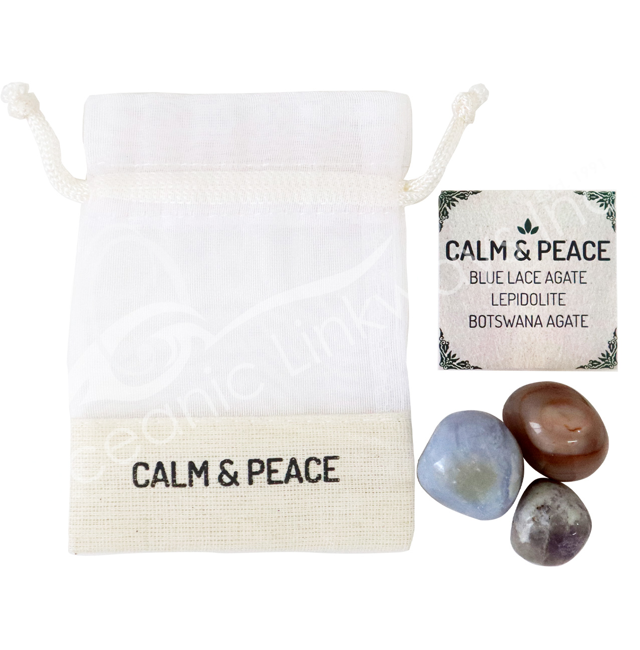 TUMBLED STONES KIT – CALM & PEACE/BLUE LACE AGATE, LEPIDOLITE, BOSTWANA AGATE 15-35 MM