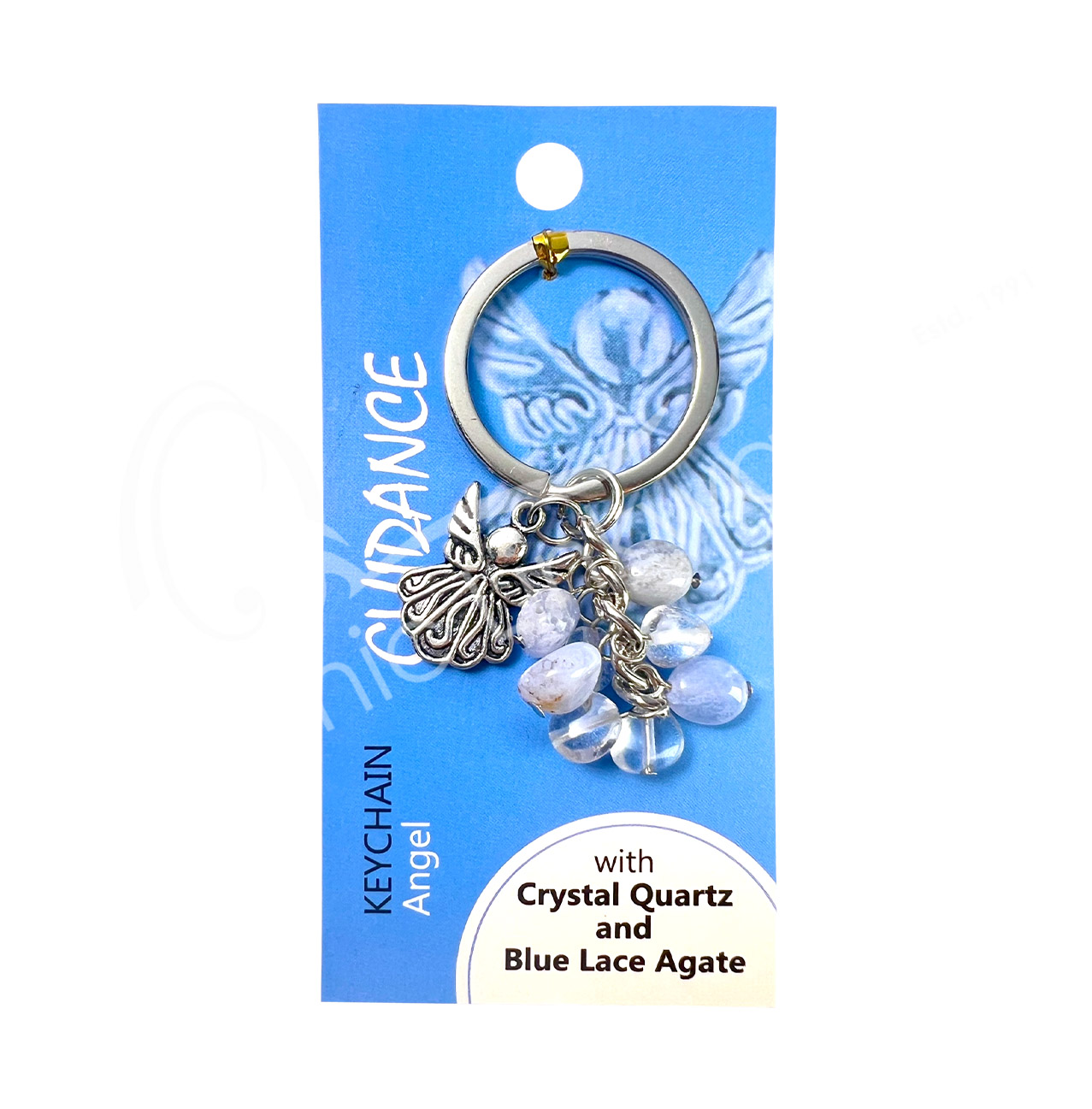 KEYCHAIN – NUGGETS AGATE, BLUE LACE & CRYSTAL QUARTZ WITH ANGEL 2.5-2.75″L