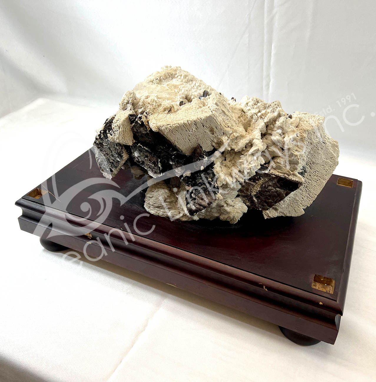 SPECIMEN – ALBITE WITH GREEN MICA & BLACK TOURMALINE ON WOOD BASE 17″L X 8″W