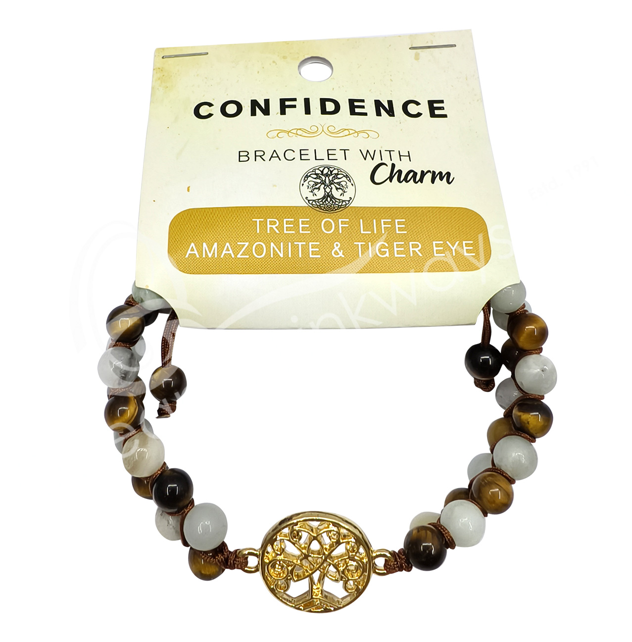 BRACELET – ADJUSTABLE DOUBLE ROW TREE OF LIFE CHARM WITH MIXED AMAZONITE & TIGER EYE (4 MM) 6.7-8.65″