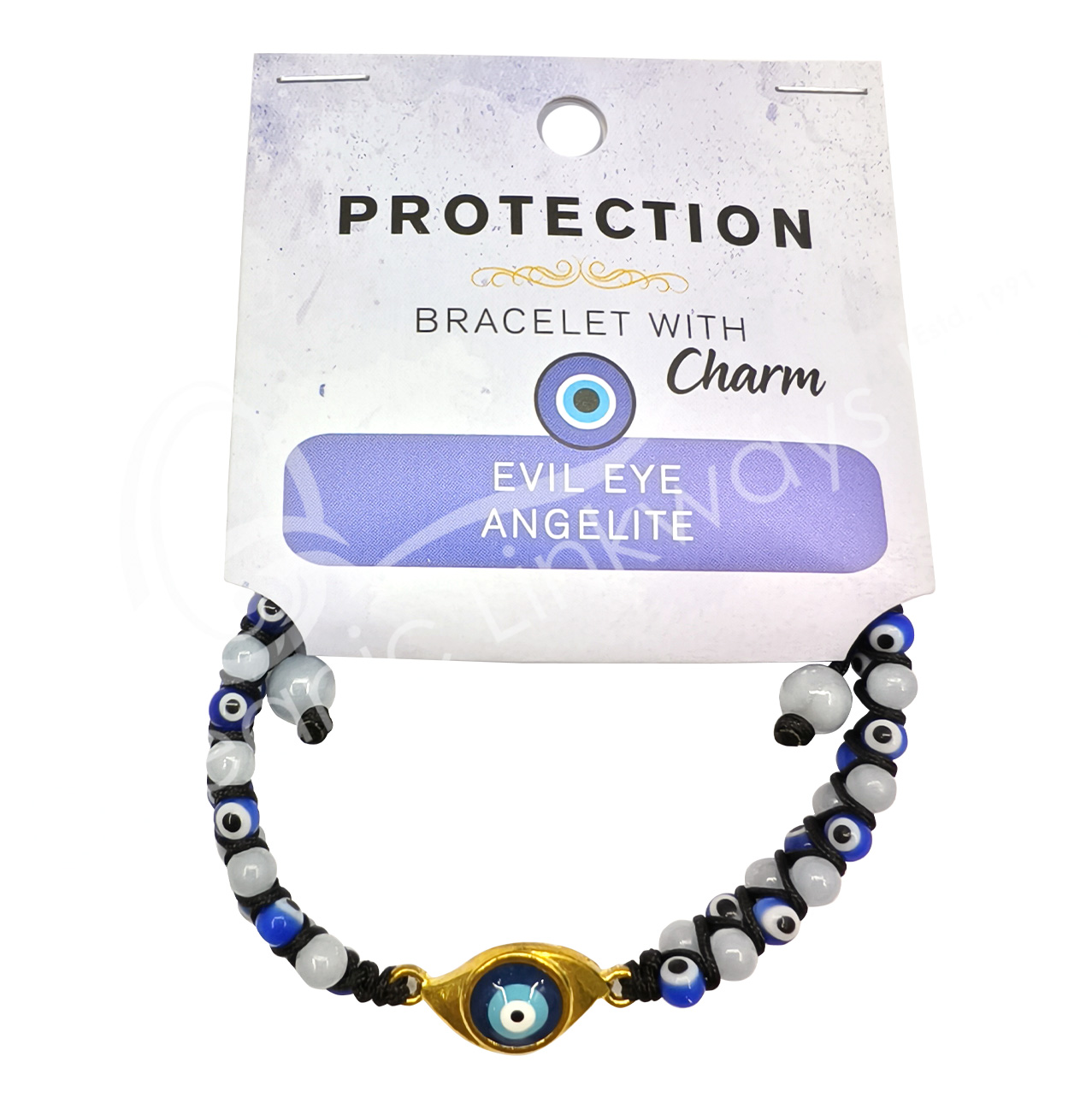 BRACELET – ADJUSTABLE DOUBLE ROW EVIL EYE CHARM WITH EVIL EYE GLASS & ANGELITE (4 MM) 6.7-8.65″