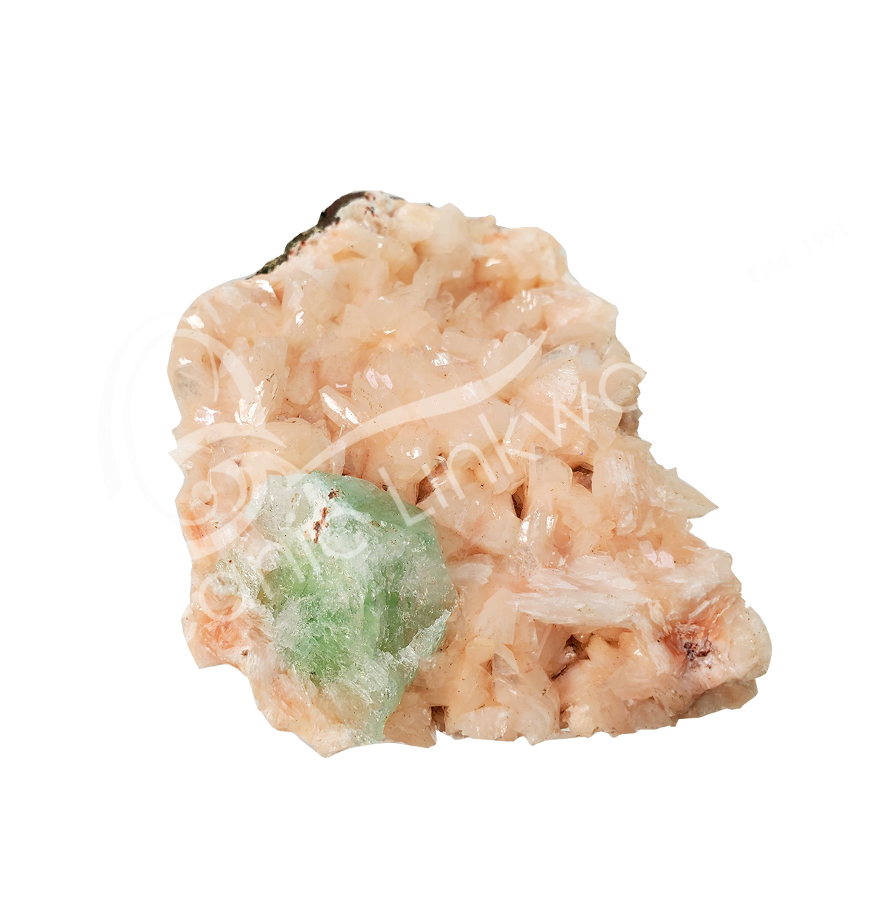(CLOSE OUT) SPECIMEN – STILBITE, PEACH WITH GREEN CUT POINT APOPHYLLITE ON METAL STAND 23 X 25″