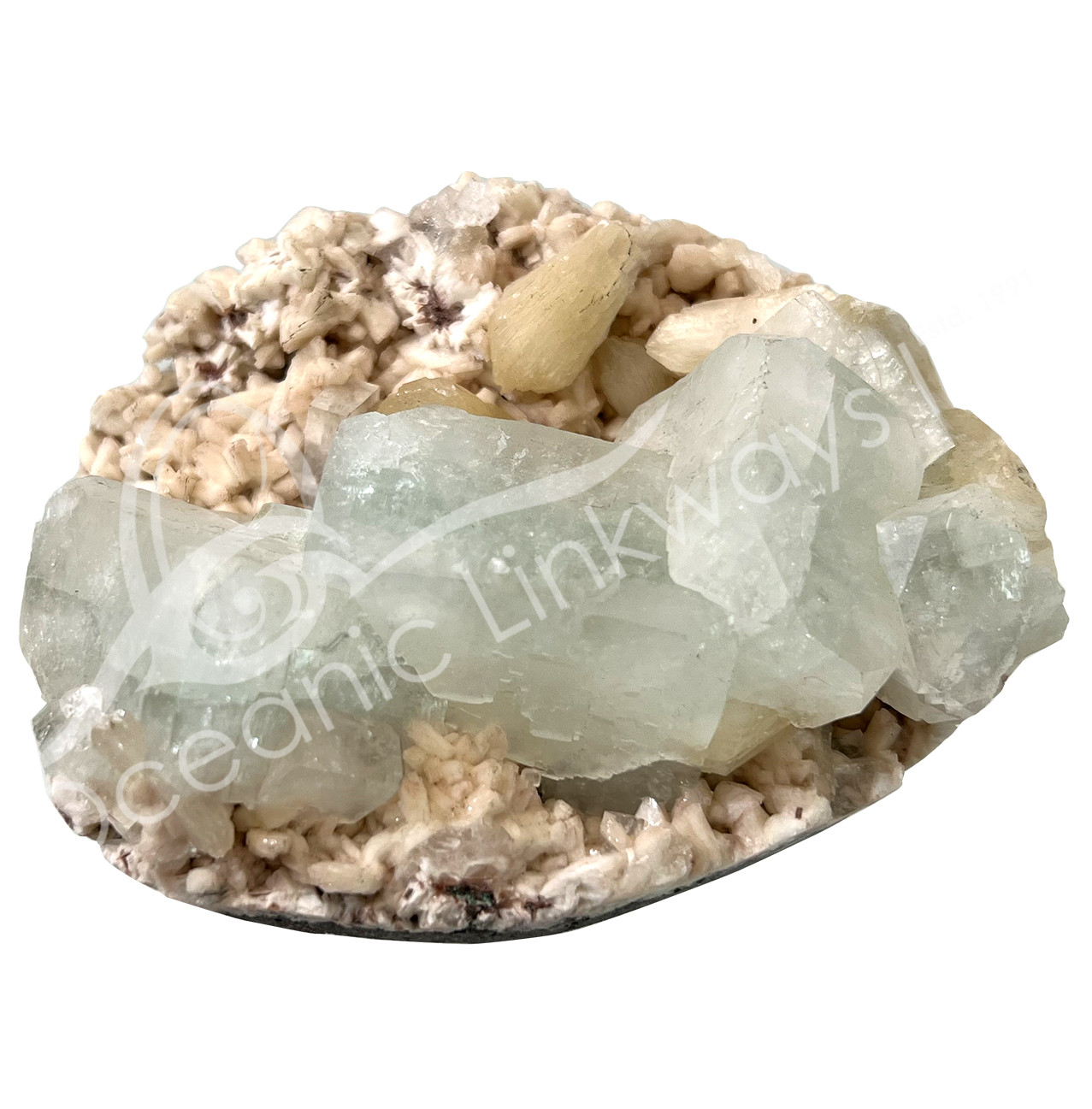 CLUSTER – STILBITE & GREEN APOPHYLLITE ON OKENITE MATRIX 2-14″