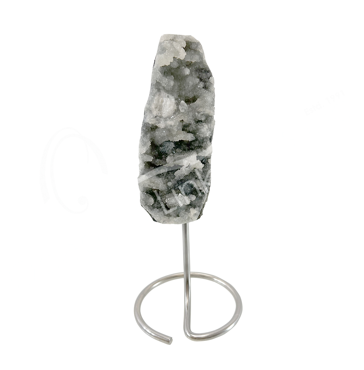 (CLOSE OUT) SPECIMEN – APOPHYLLITE ON SILVER METAL STAND 7-10.5″H