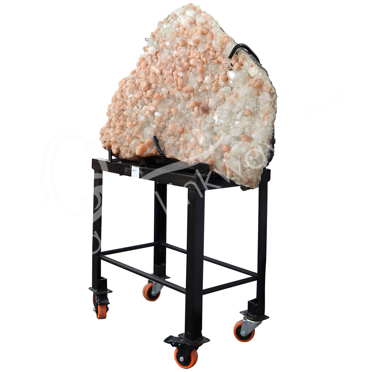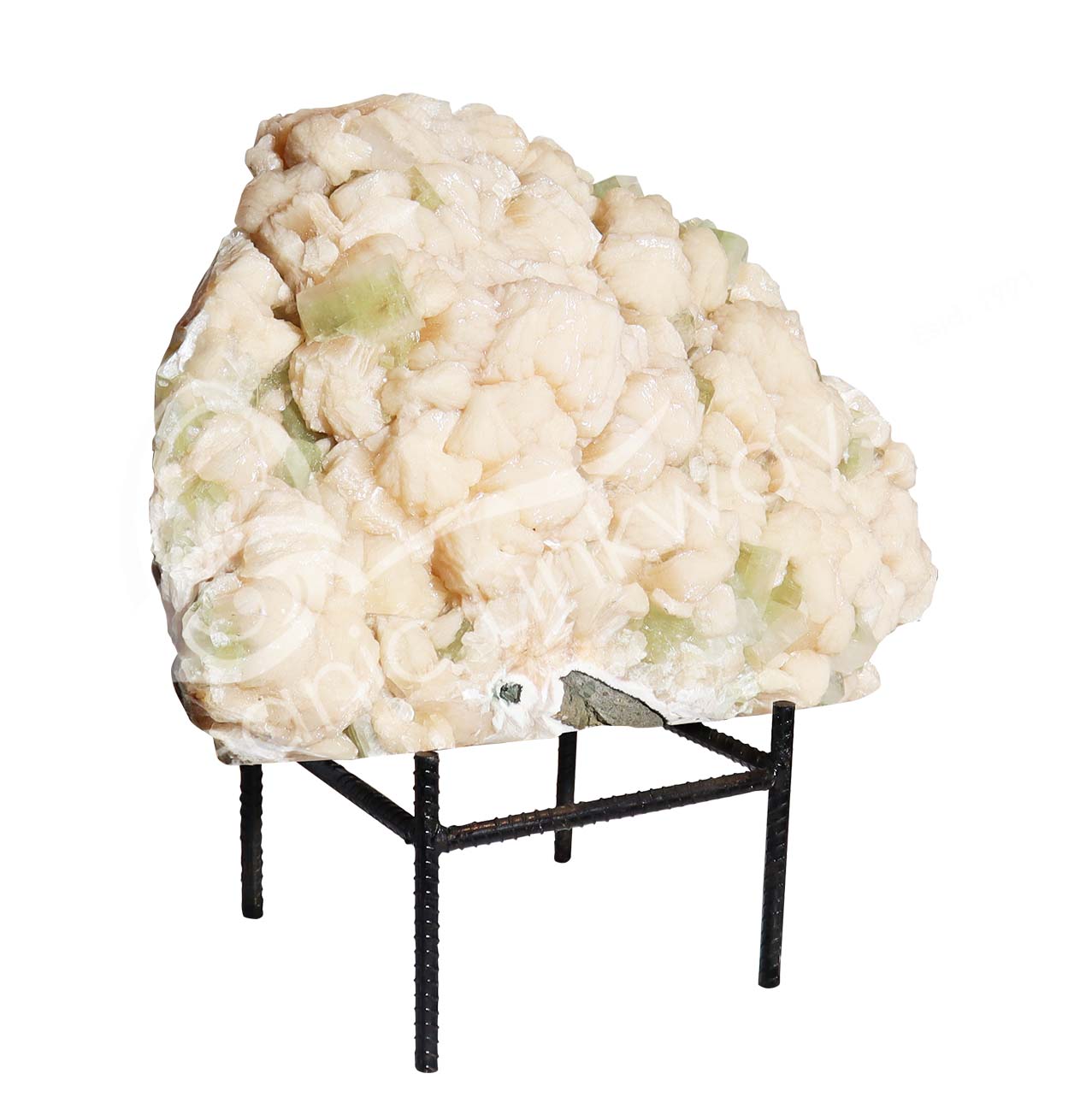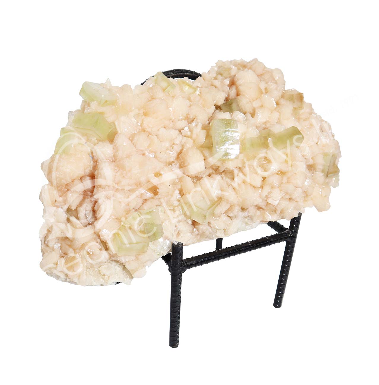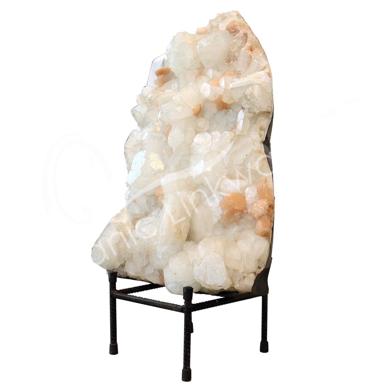 (CLOSE OUT) SPECIMEN – STILBITE, PEACH WITH GREEN CUT POINT APOPHYLLITE ON METAL STAND 15 X 19″