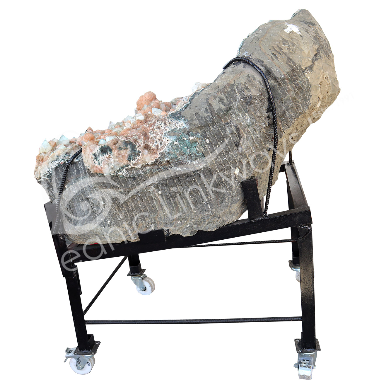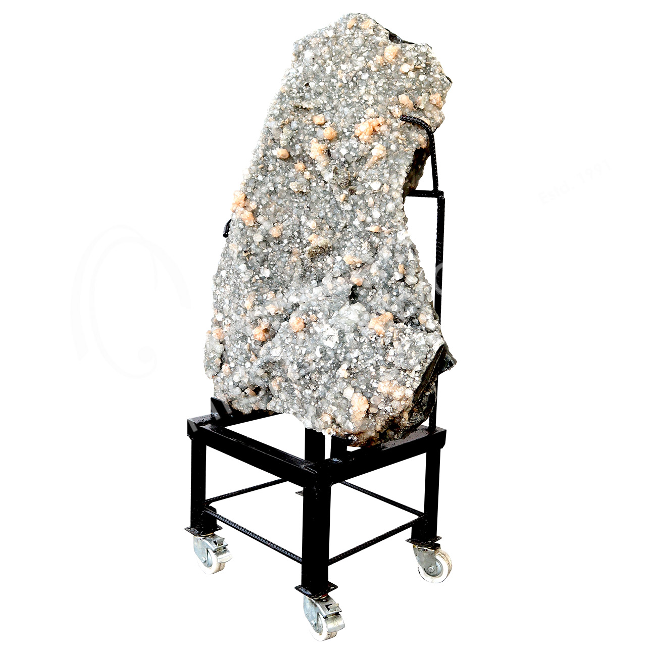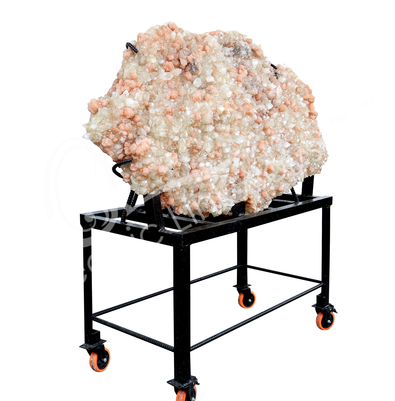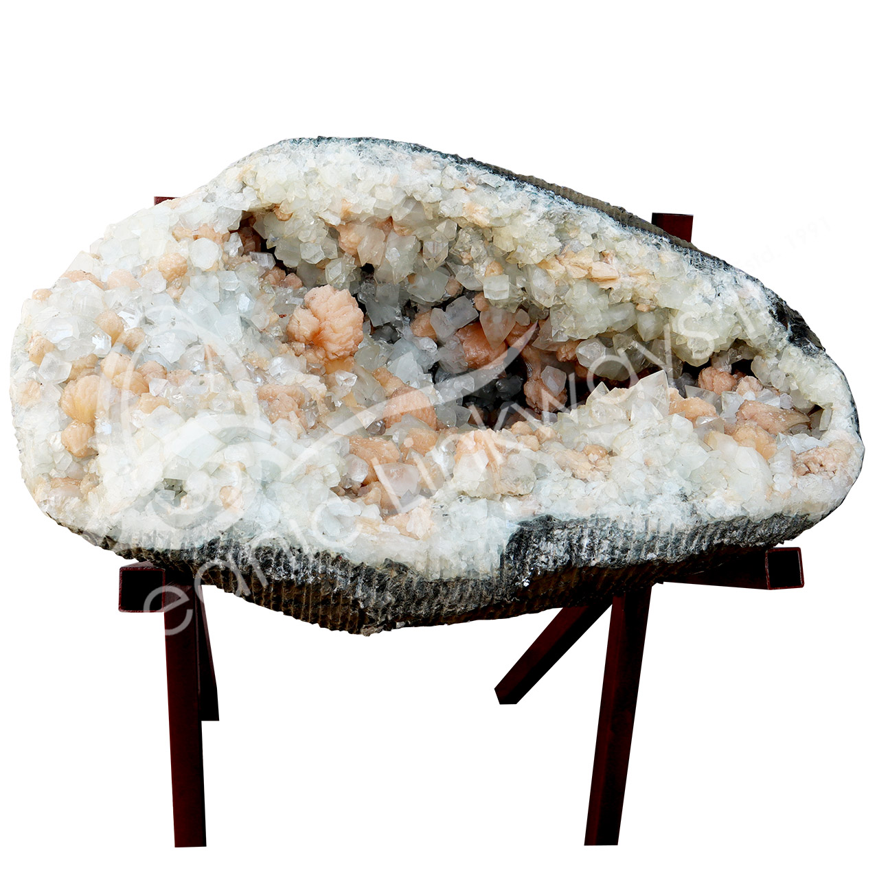 (CLOSE OUT) SPECIMEN – STILBITE, PEACH WITH GREEN CUT POINT APOPHYLLITE ON METAL STAND 15 X 19″