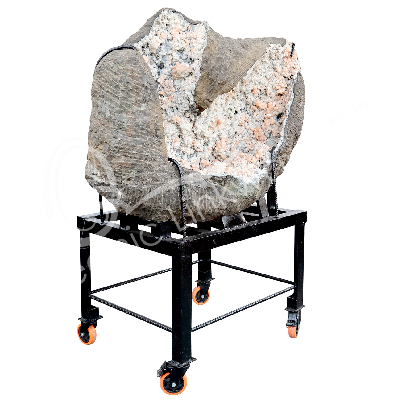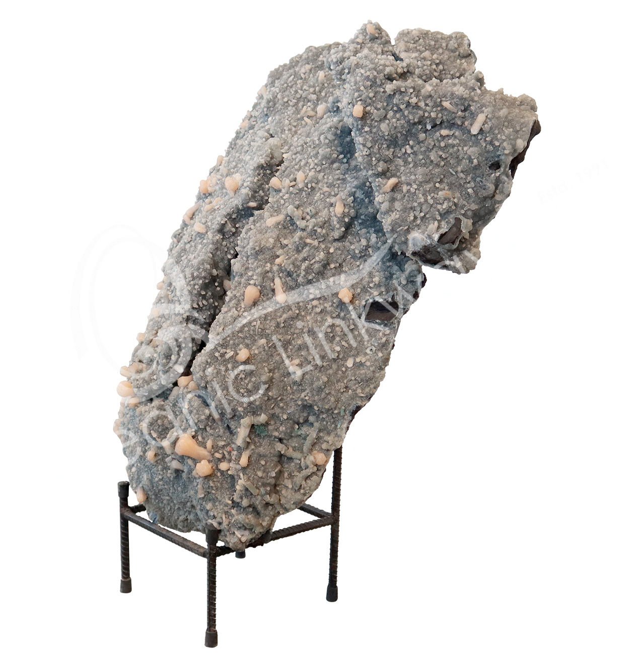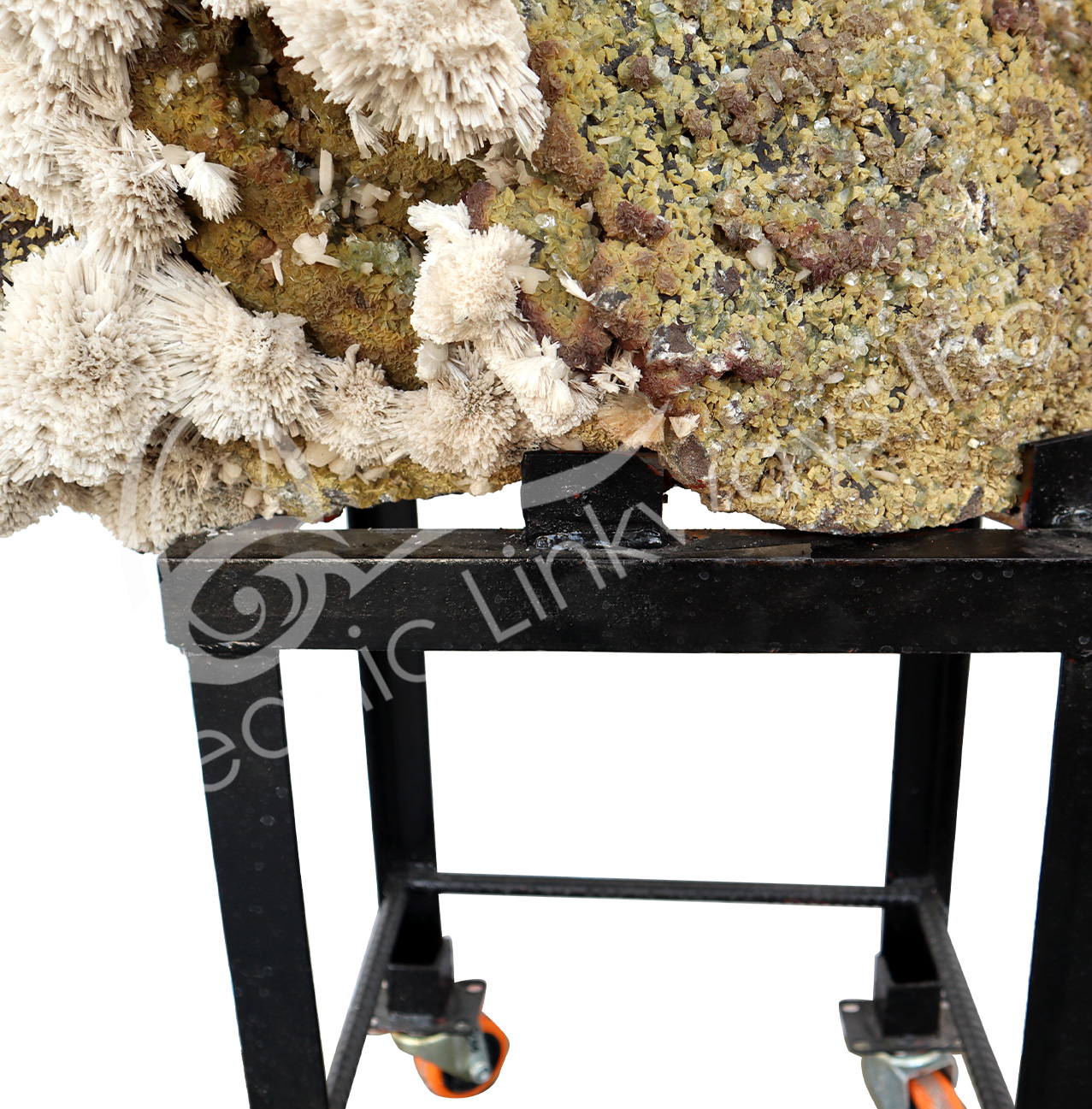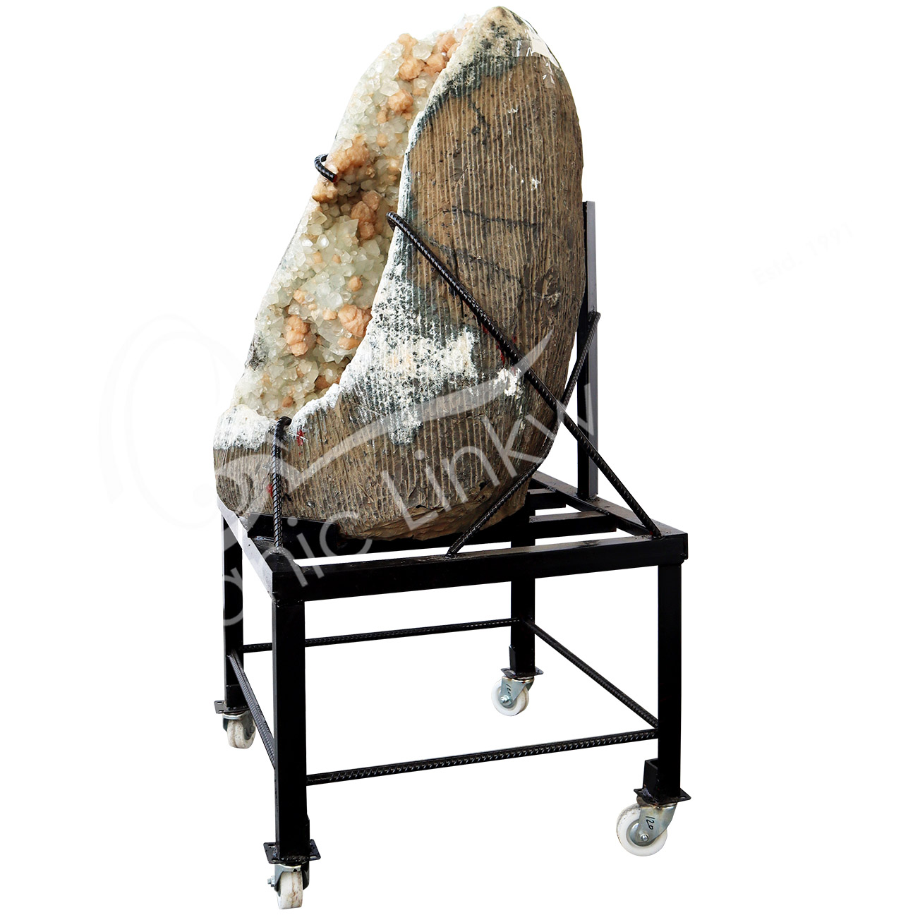 (CLOSE OUT) SPECIMEN – STILBITE, PEACH WITH GREEN CUT POINT APOPHYLLITE ON METAL STAND 15 X 19″