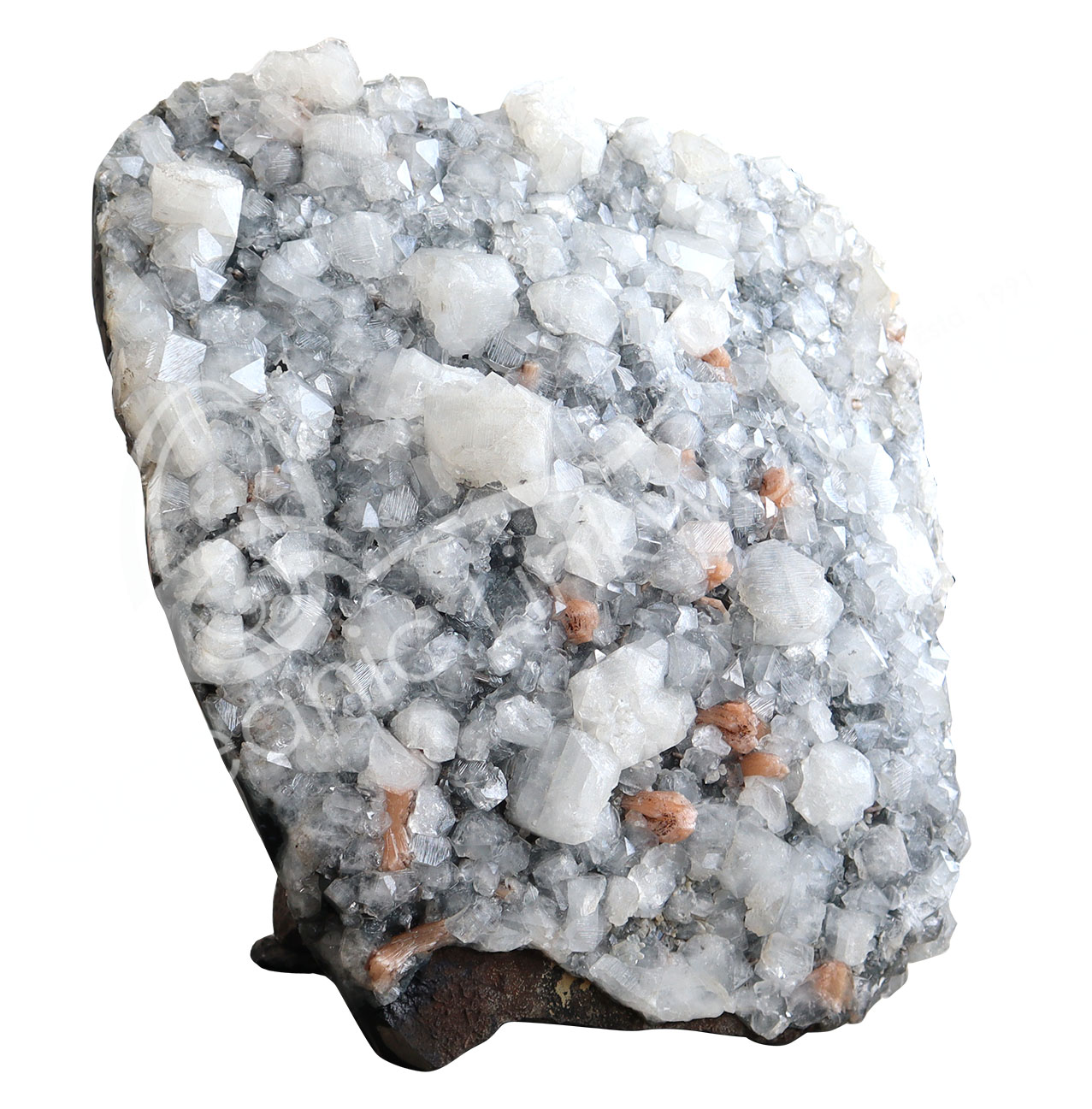 (CLOSE OUT) SPECIMEN – APOPHYLLITE & STILBITE, MIXED COLORS ON METAL STAND 15 X 15″