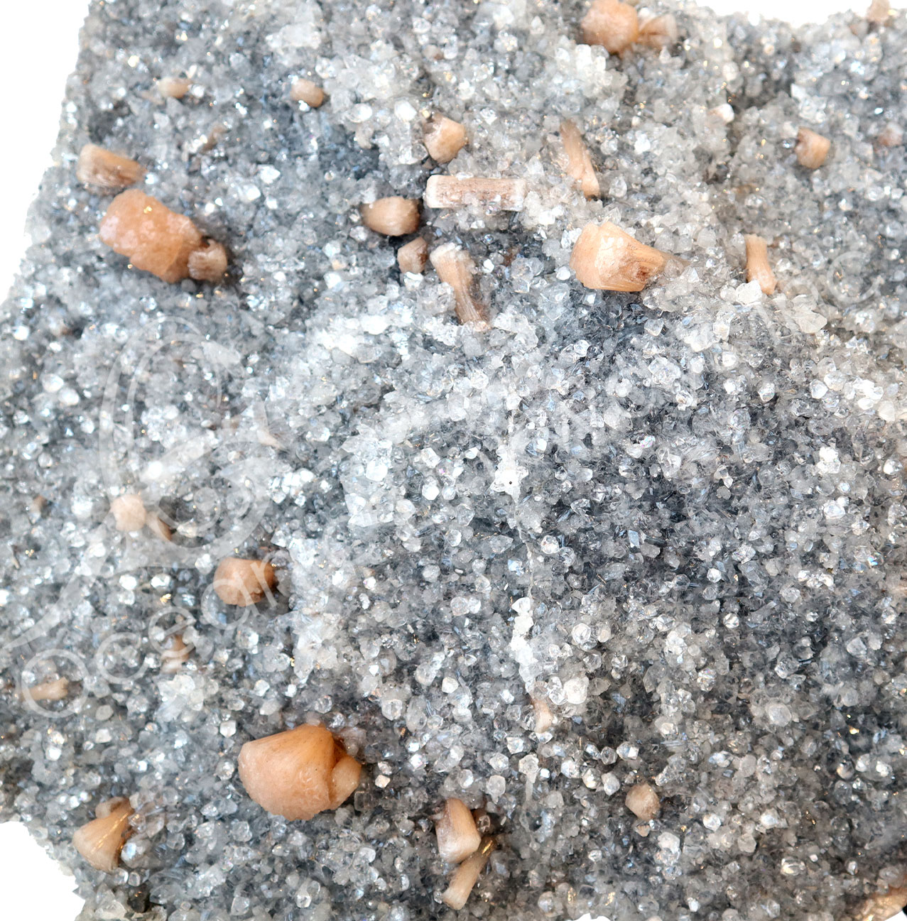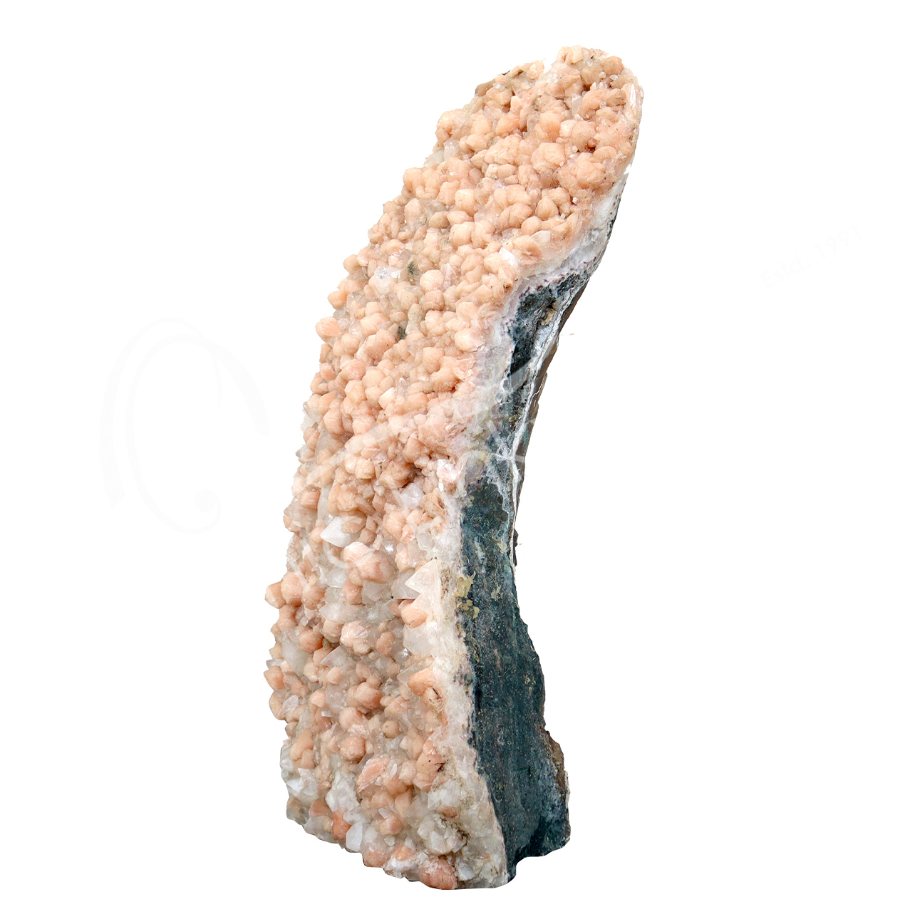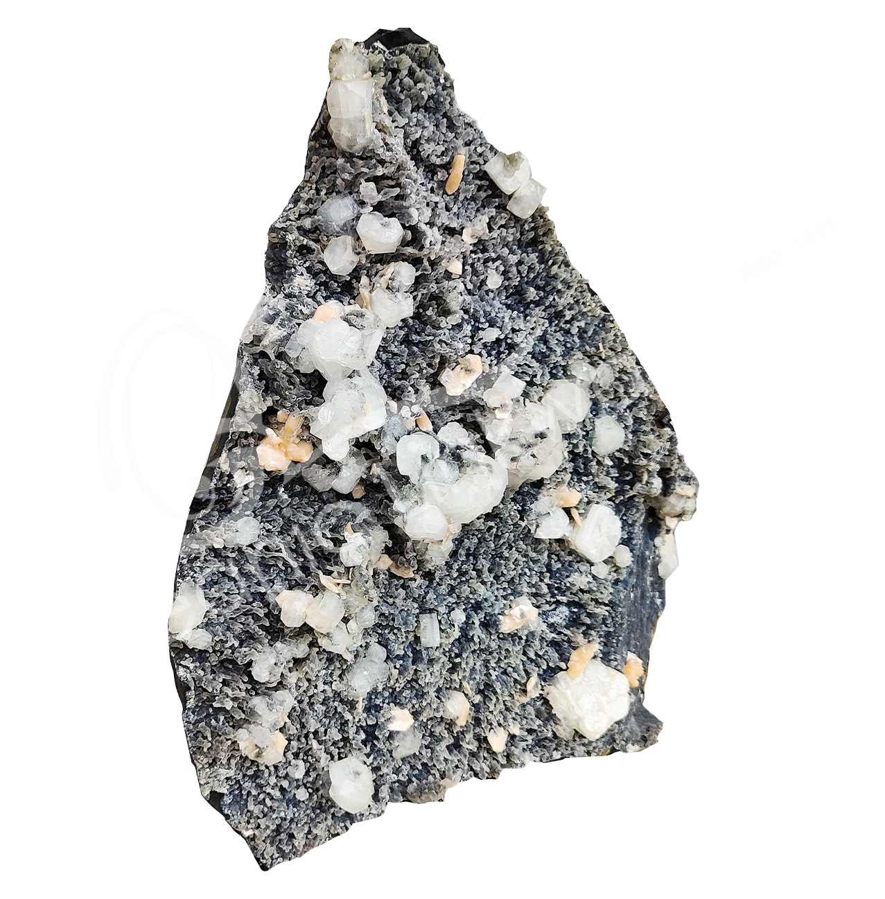 SPECIMEN – APOPHYLLITE & PEACH STILBITE ON BLACK CHALCEDONY 2-14″