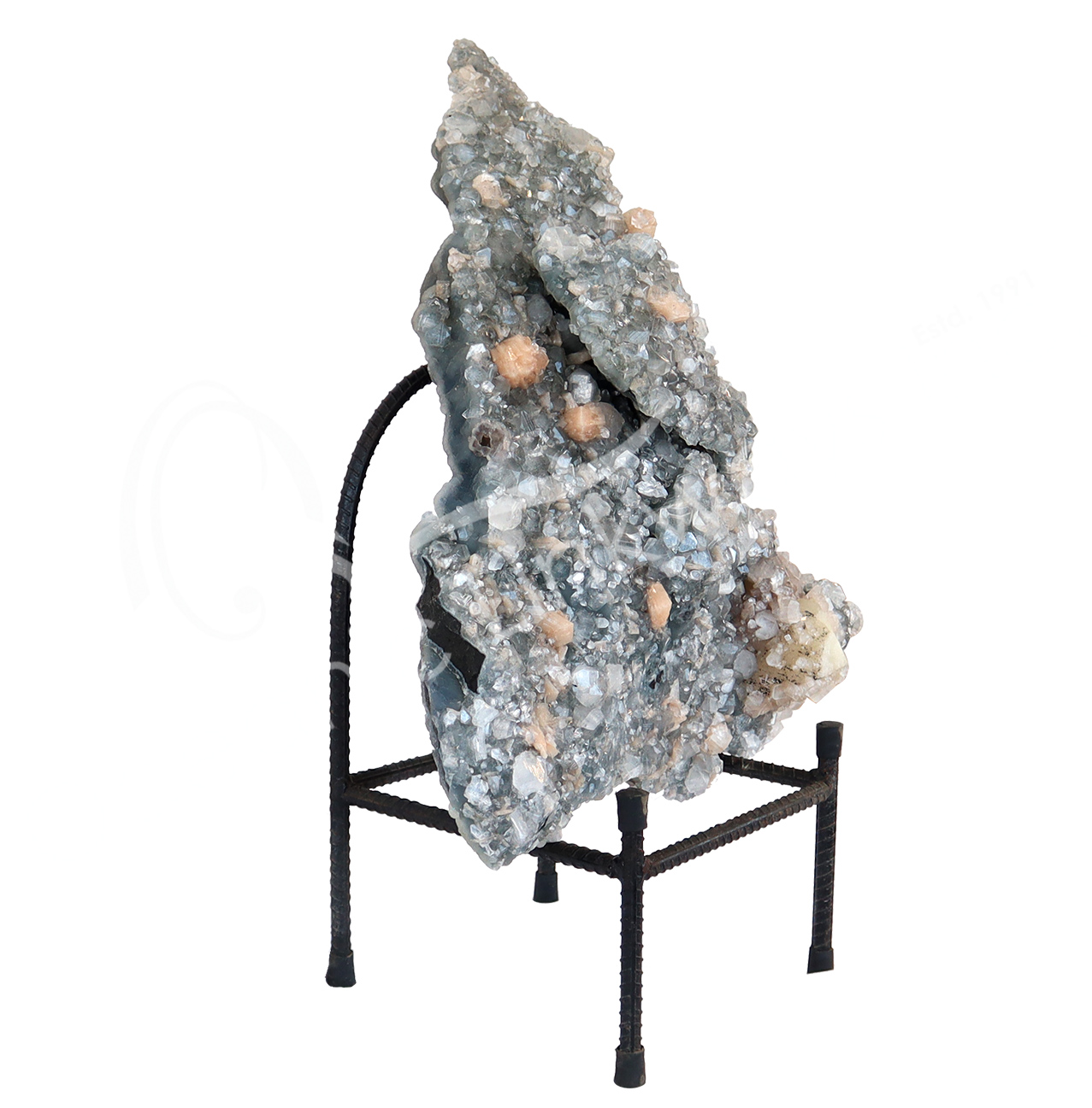 (CLOSE OUT) SPECIMEN – APOPHYLLITE & STILBITE, MIXED COLORS ON METAL STAND 13 X 14″