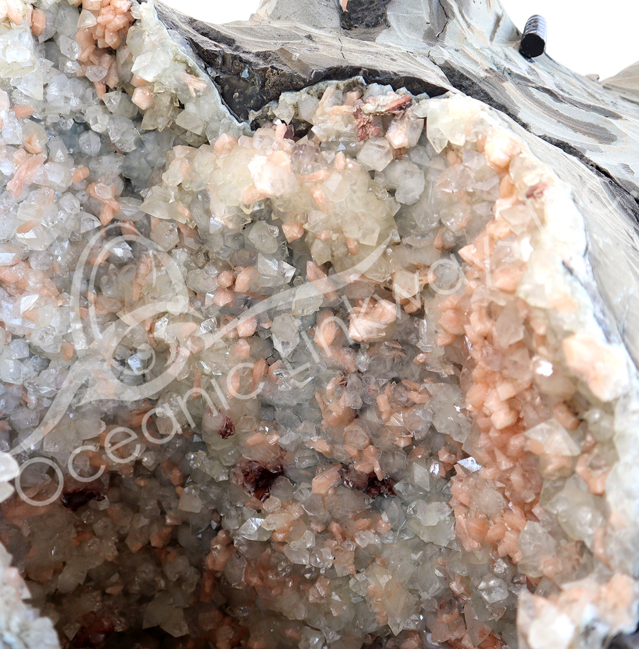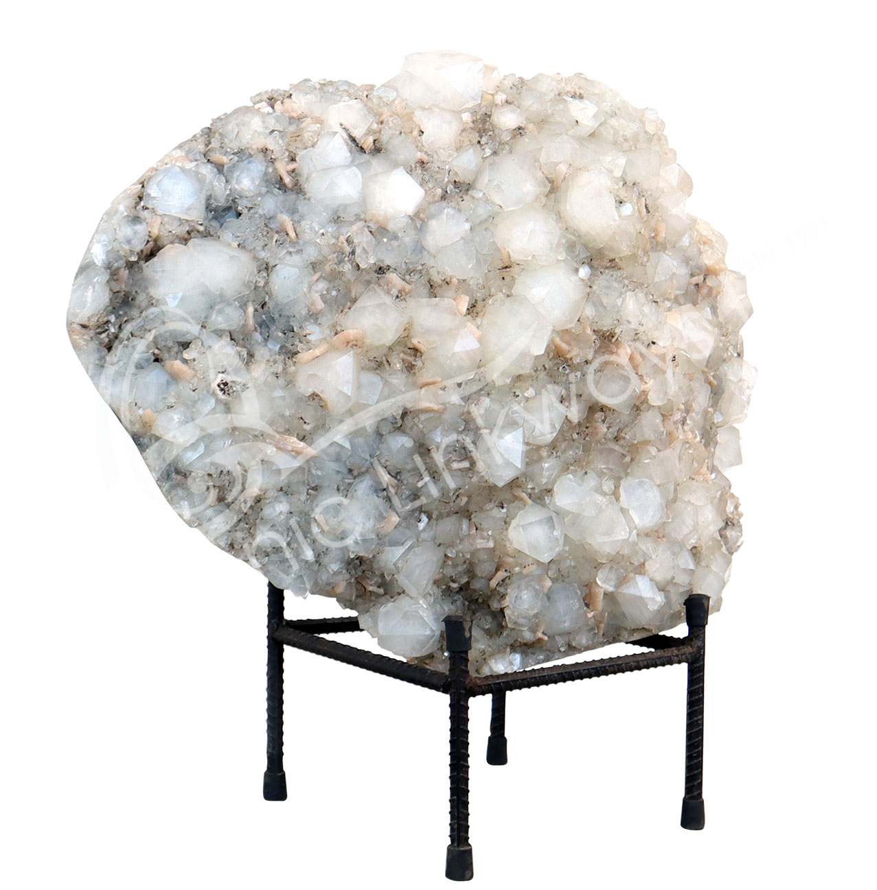 (CLOSE OUT) SPECIMEN – APOPHYLLITE & STILBITE, MIXED COLORS ON METAL STAND 24 X 20″