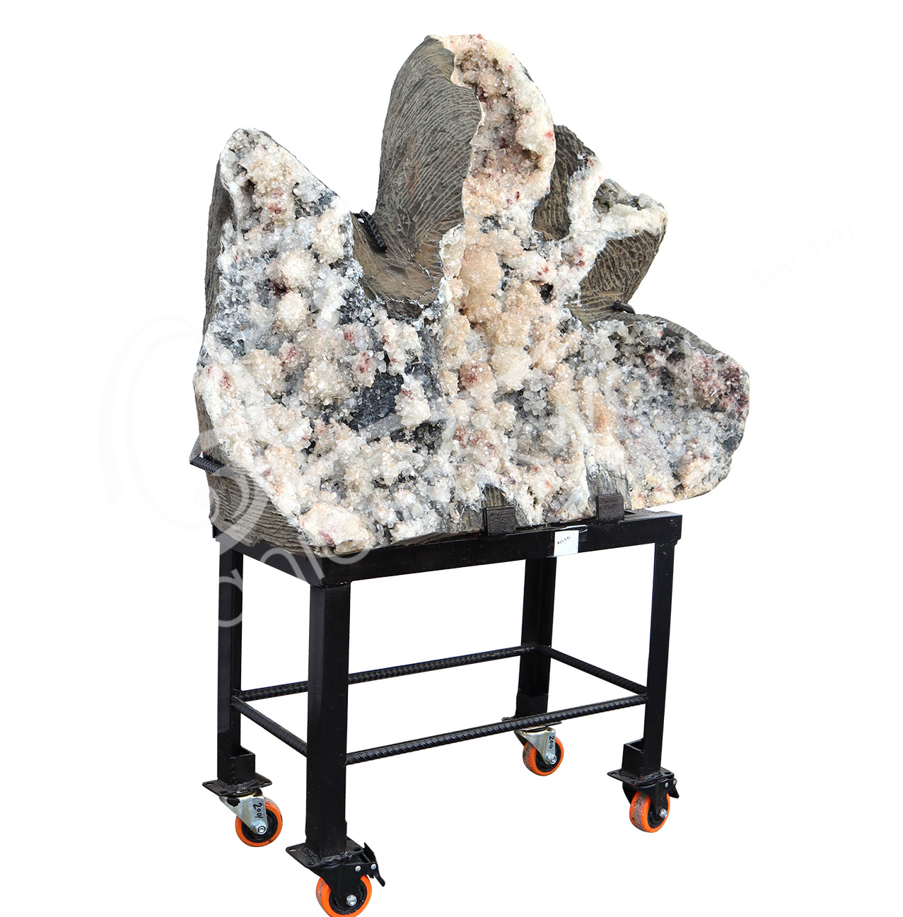 (CLOSE OUT) SPECIMEN – APOPHYLLITE & STILBITE, MIXED COLORS ON METAL STAND 15.5 X 19″