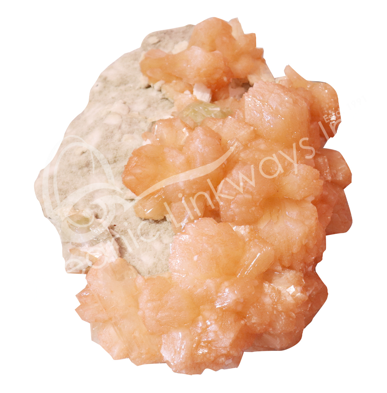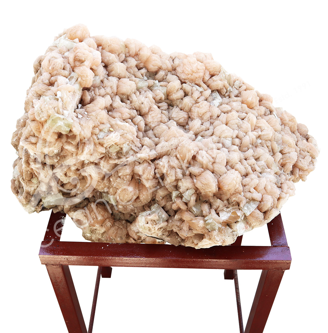 (CLOSE OUT) SPECIMEN – STILBITE, PEACH WITH GREEN CUT POINT APOPHYLLITE ON METAL STAND 26 X 18″