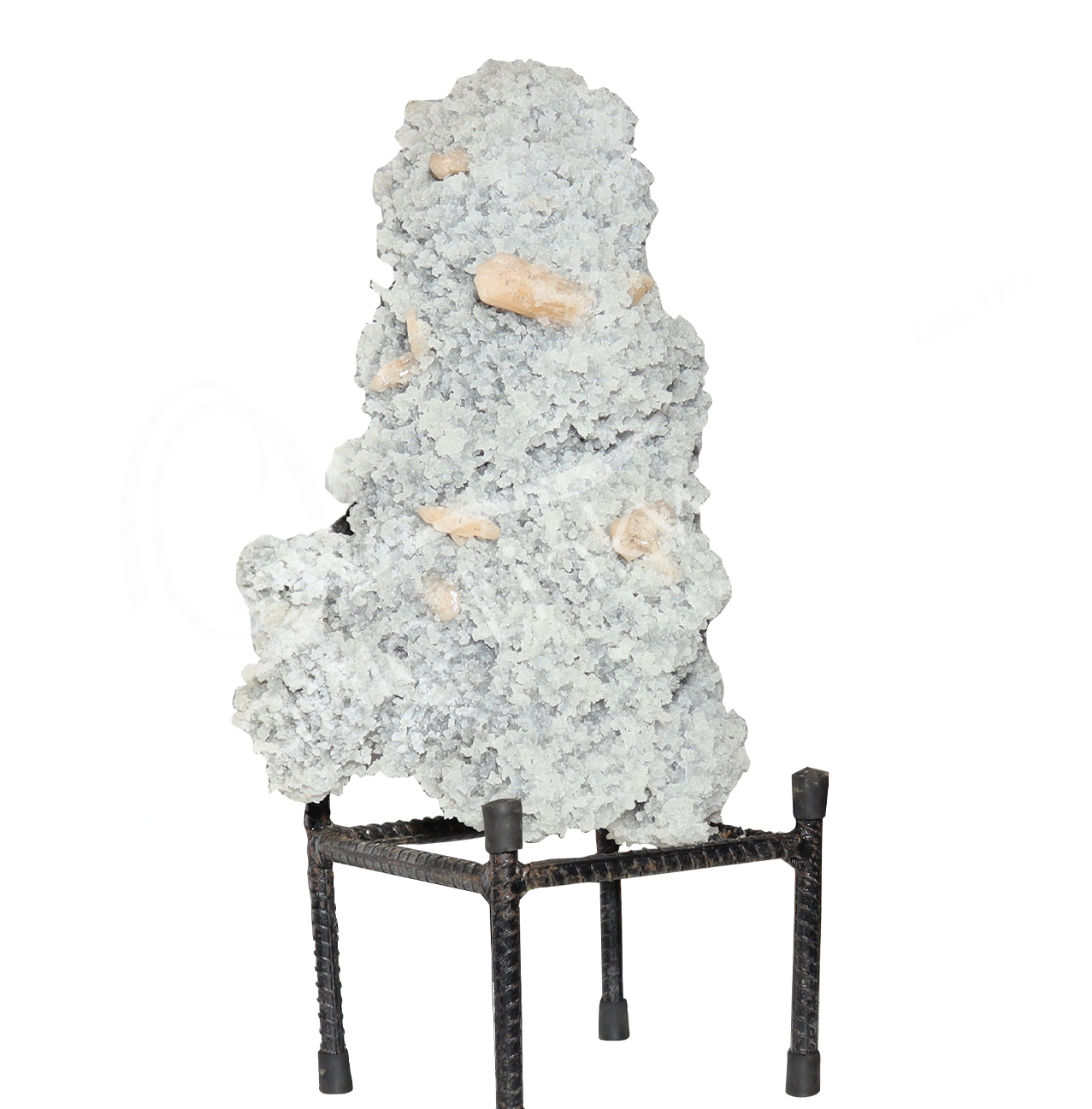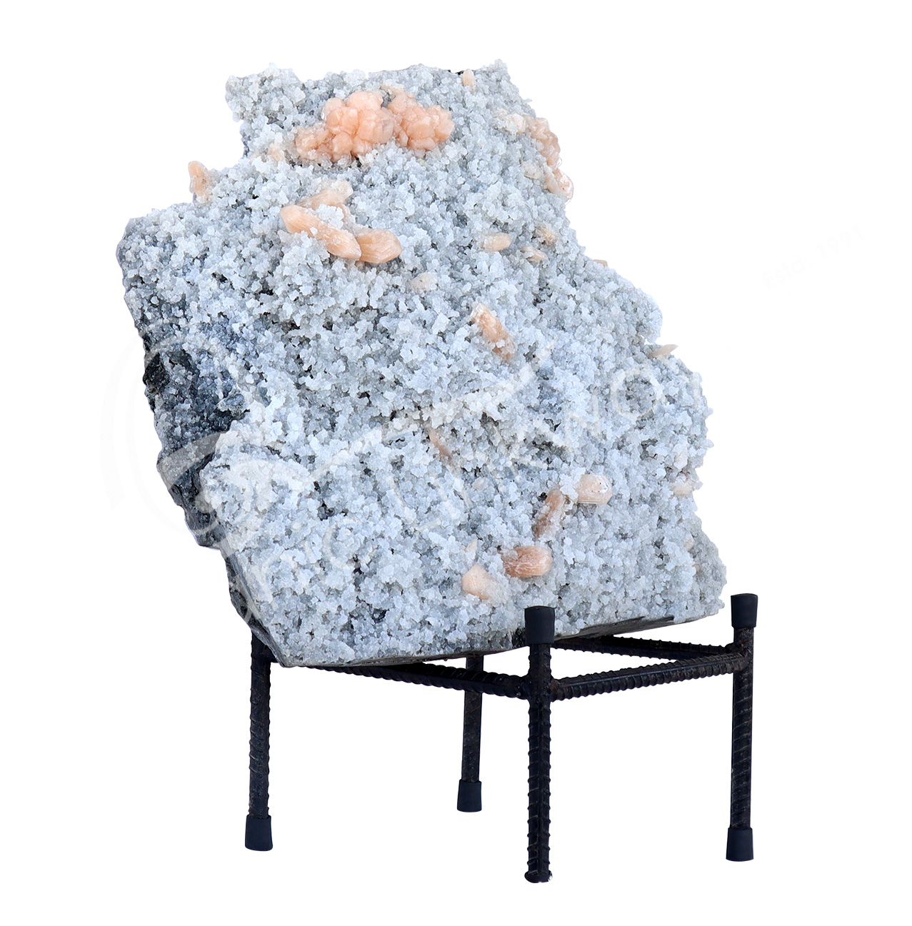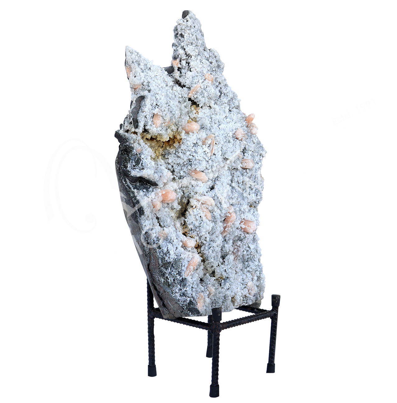 CLUSTER – CHALCEDONY, BLACK WITH APOPHYLLITE & PEACH STILBITE WITH STAND 25 X 21″