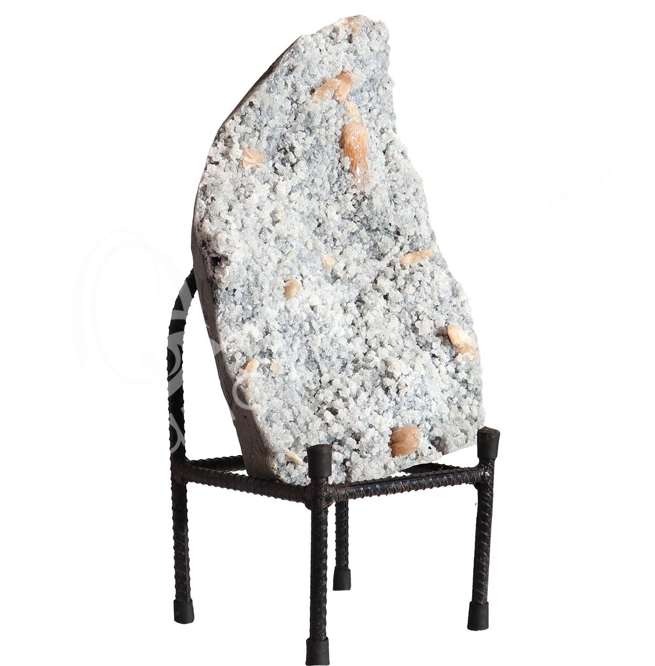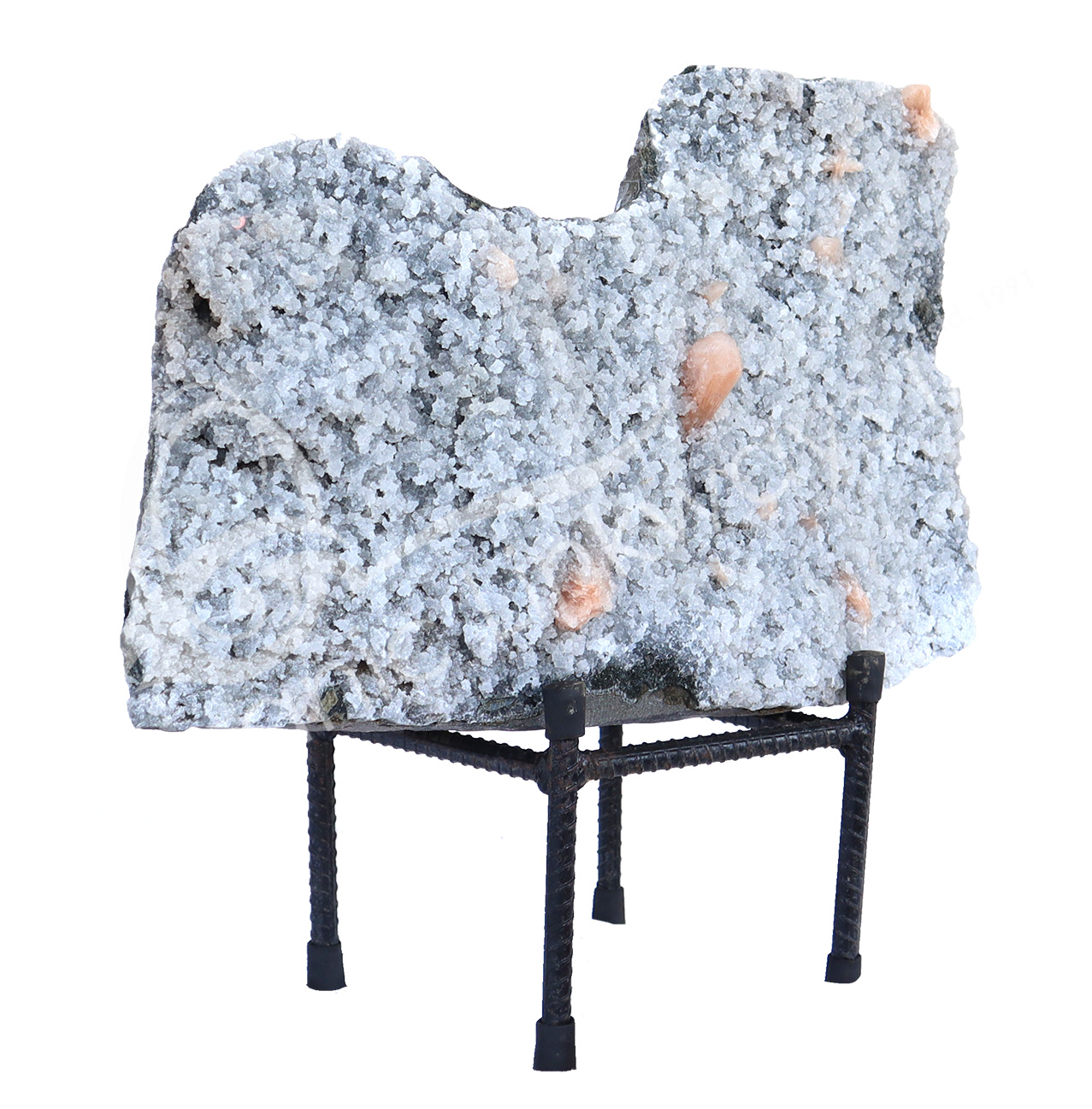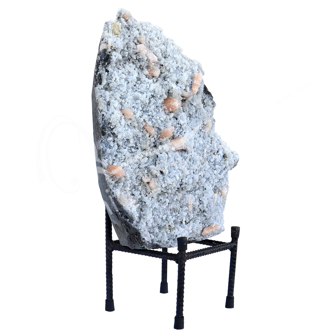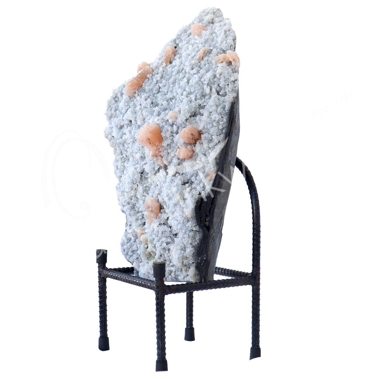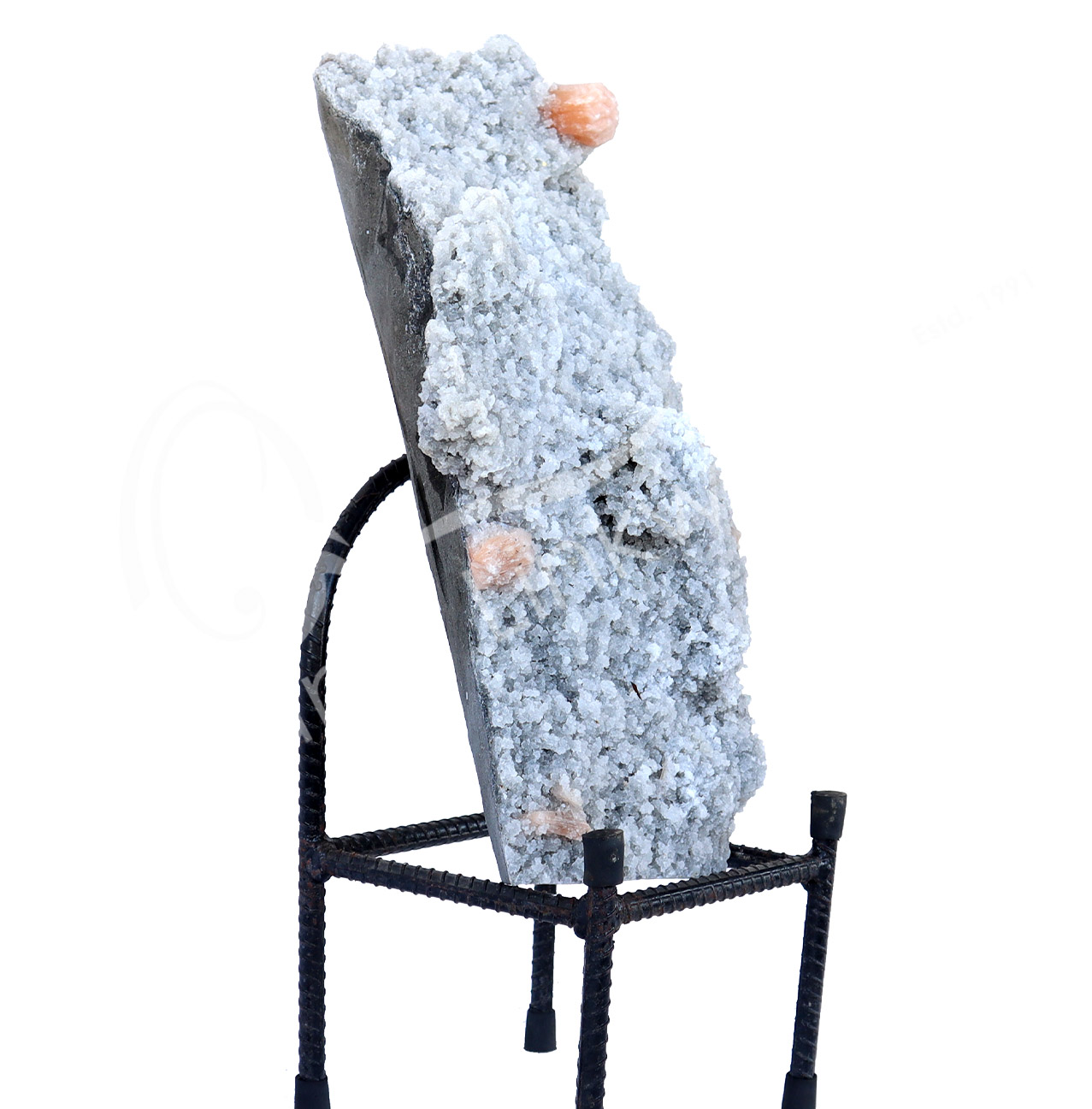 SPECIMEN – CHALCEDONY, CORAL & QUARTZ ON METAL STAND 11 X 6.5 X 13″