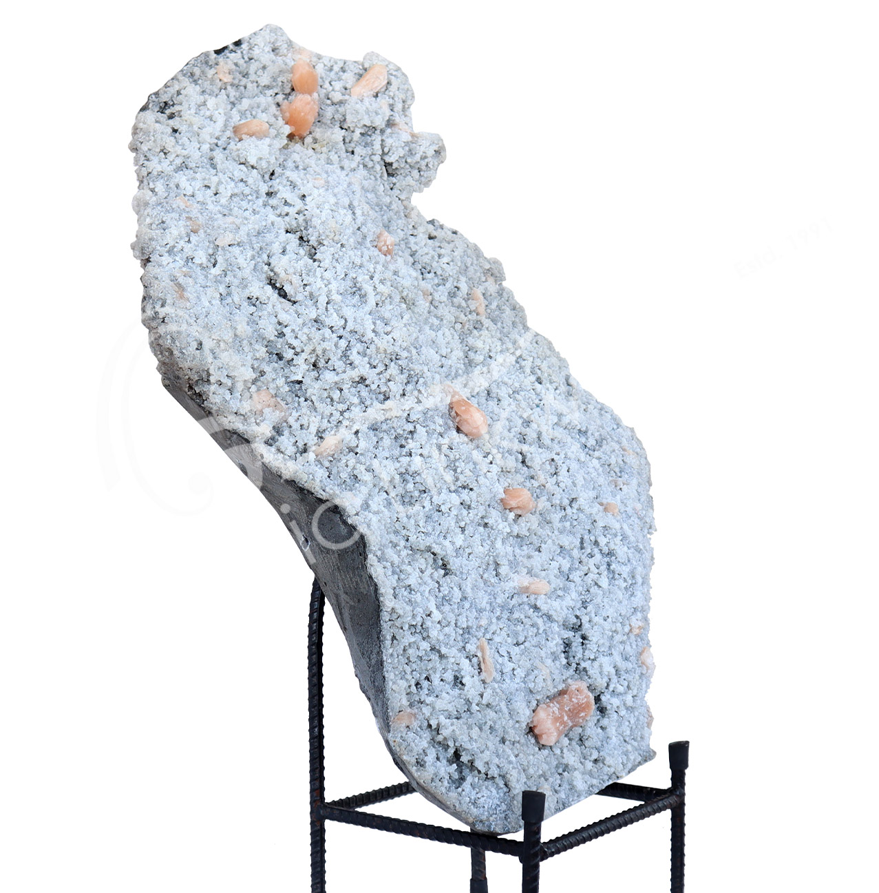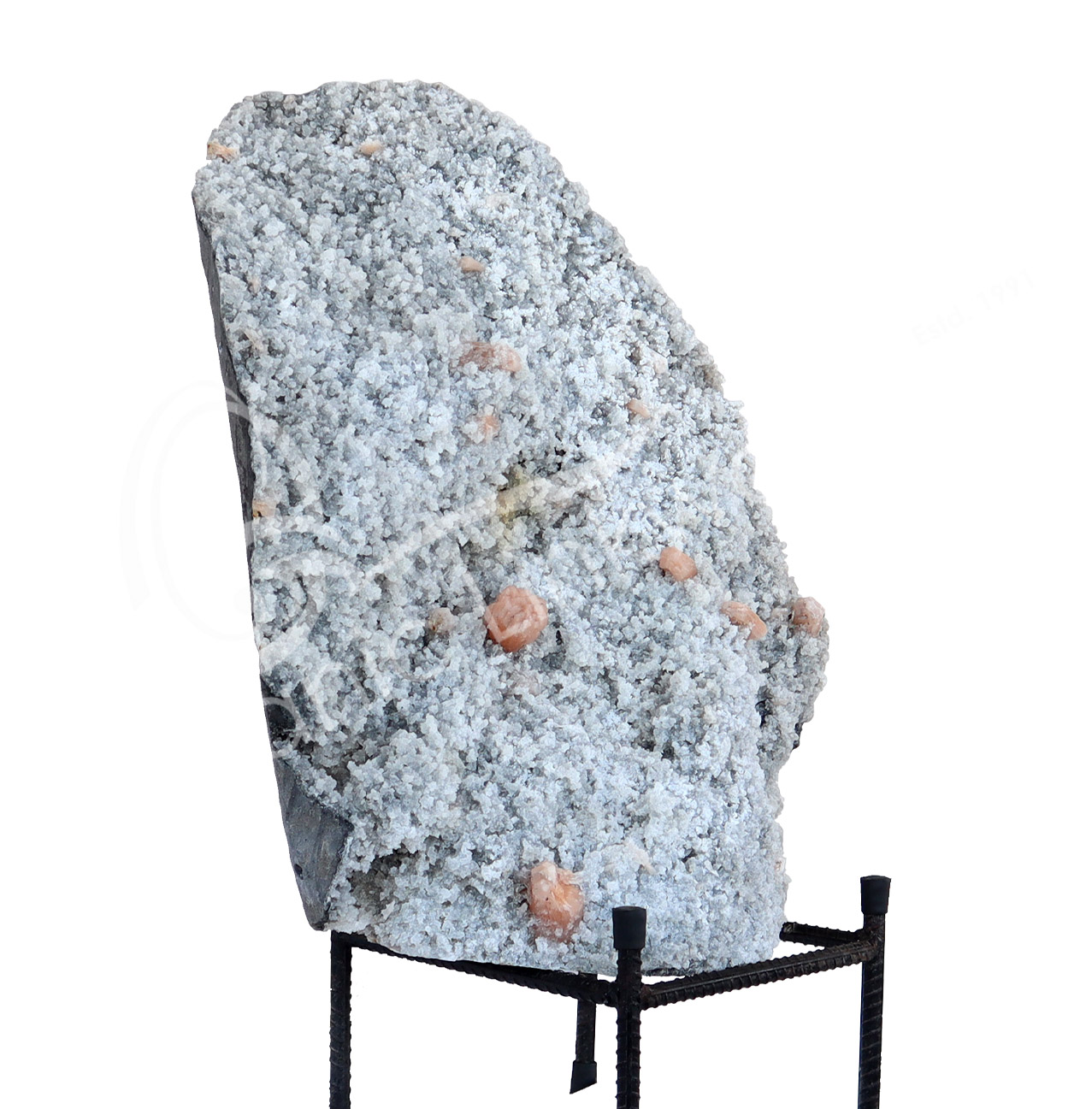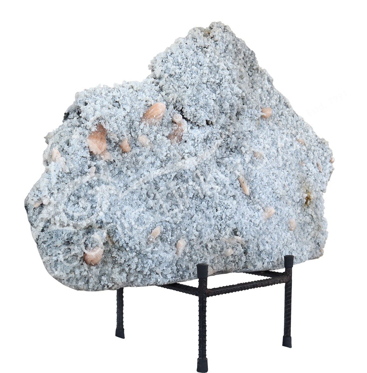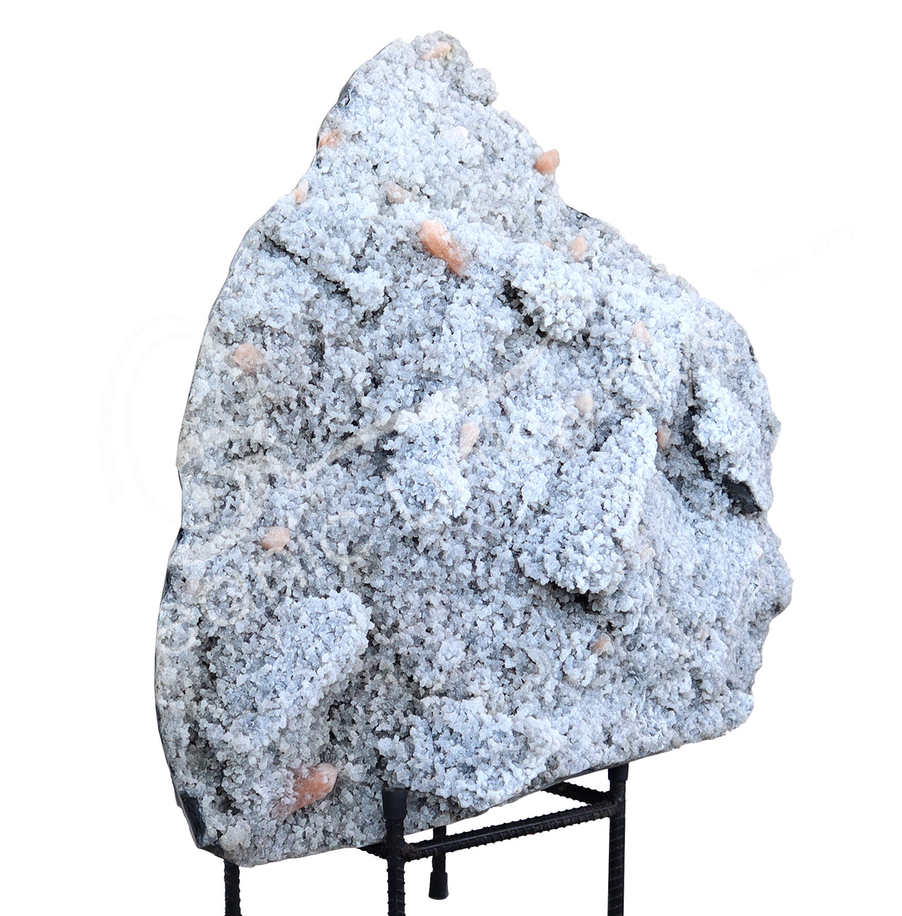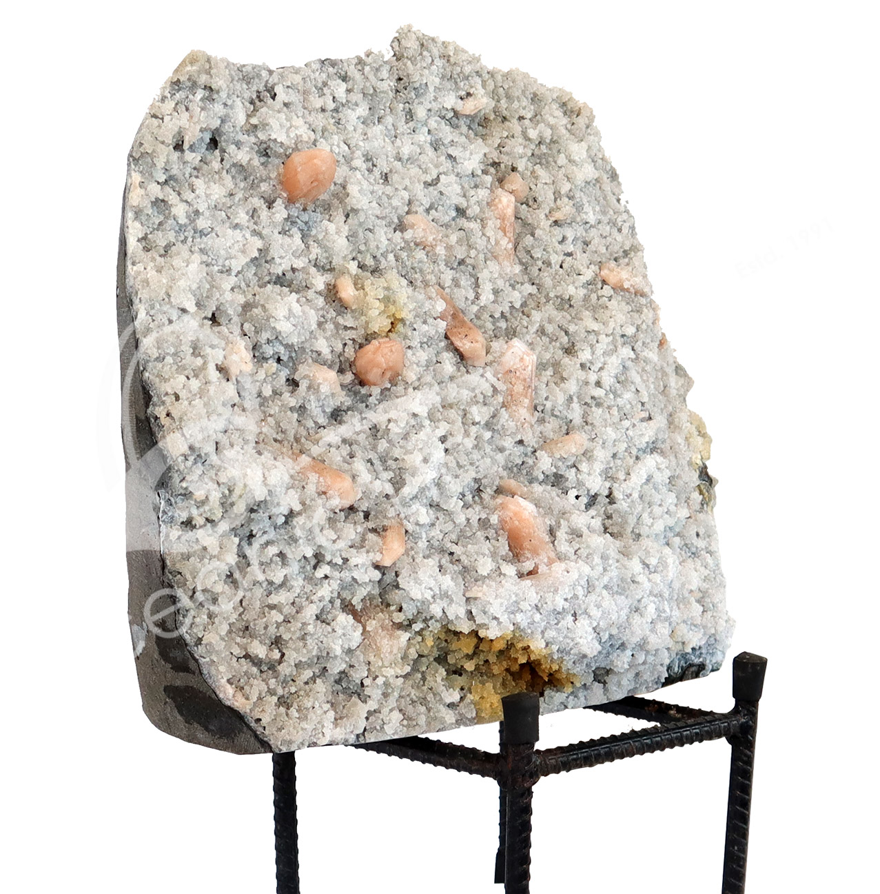 SPECIMEN – CHALCEDONY, CORAL & QUARTZ ON METAL STAND 11 X 6.5 X 13″