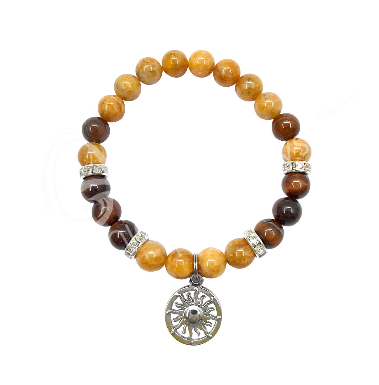 BRACELET – CALCITE, ORANGE & RED TIGER EYE W/ SUN CHARM (8-8.5 MM) 7.15-7.25″