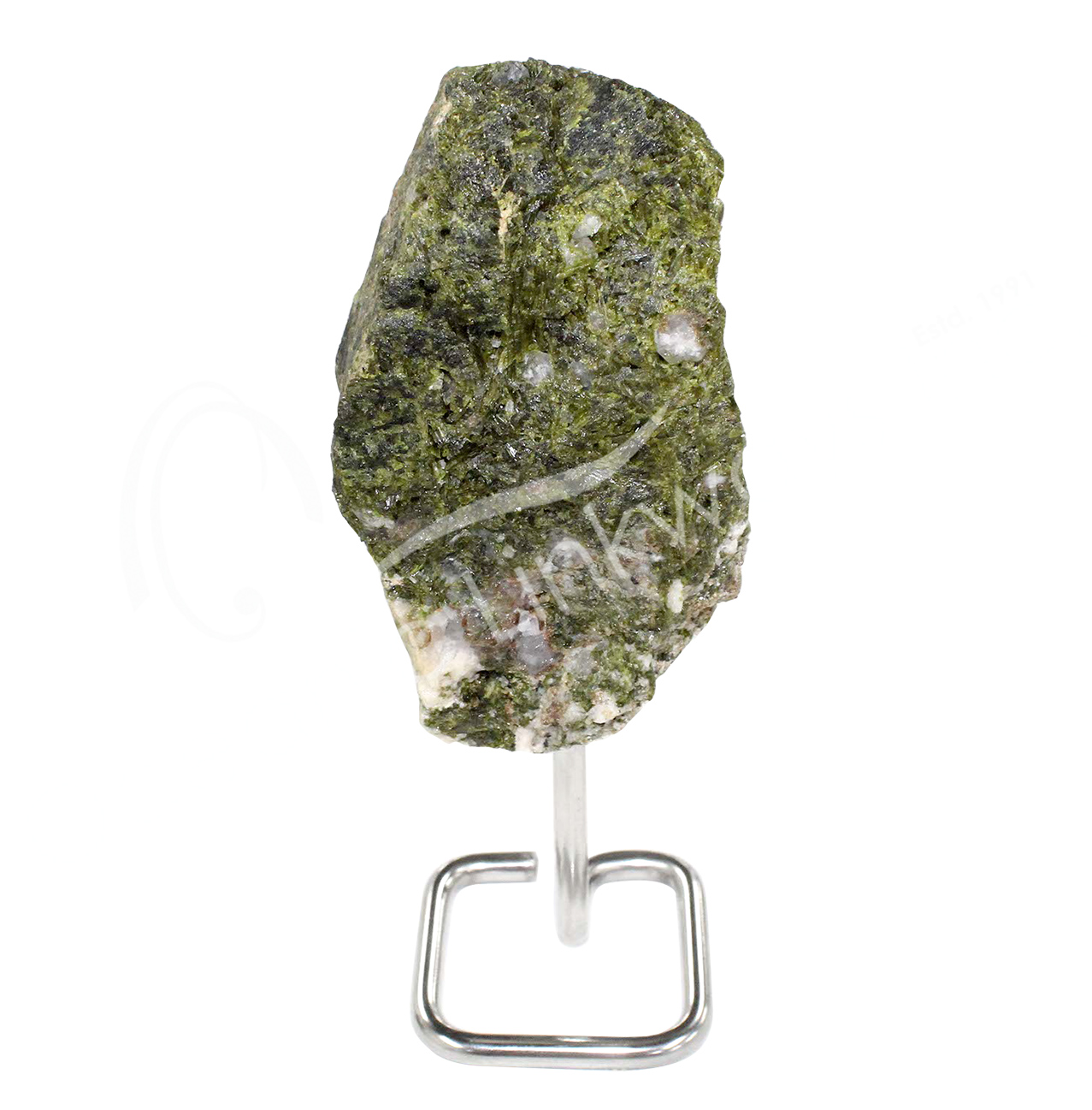 SPECIMEN – EPIDOTE WITH QUARTZ ON SILVER METAL STAND 5-5.5″