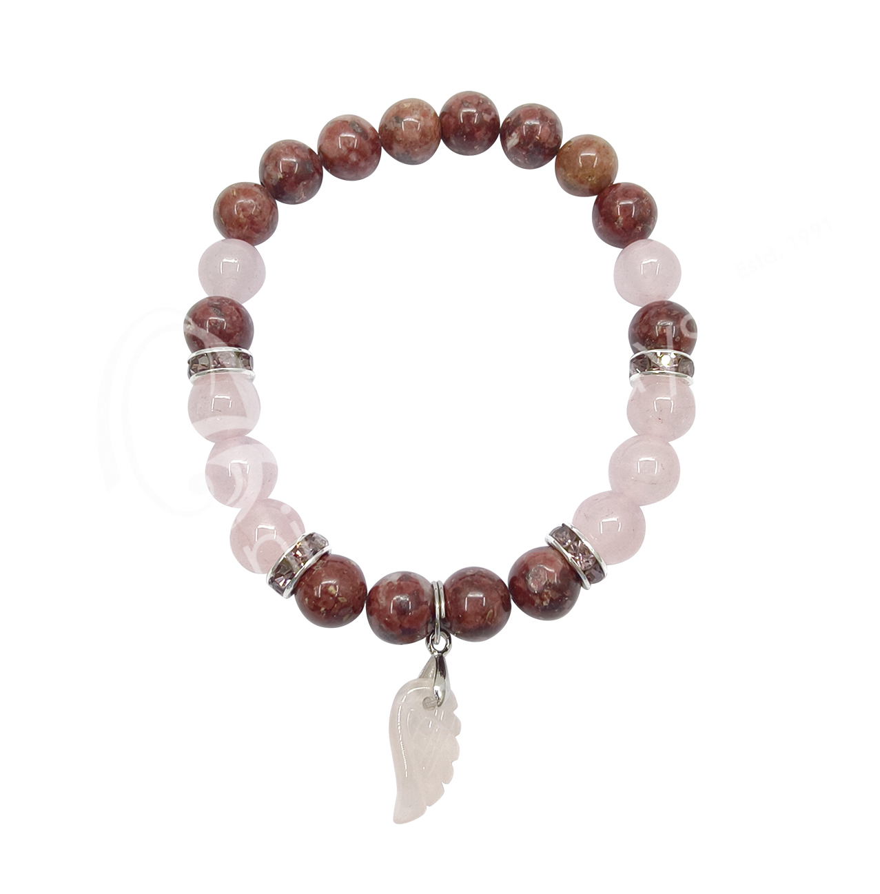 BRACELET – EUDIALYTE & ROSE QUARTZ W/ ANGEL WING CHARM (8-8.5 MM) 7.15-7.25″