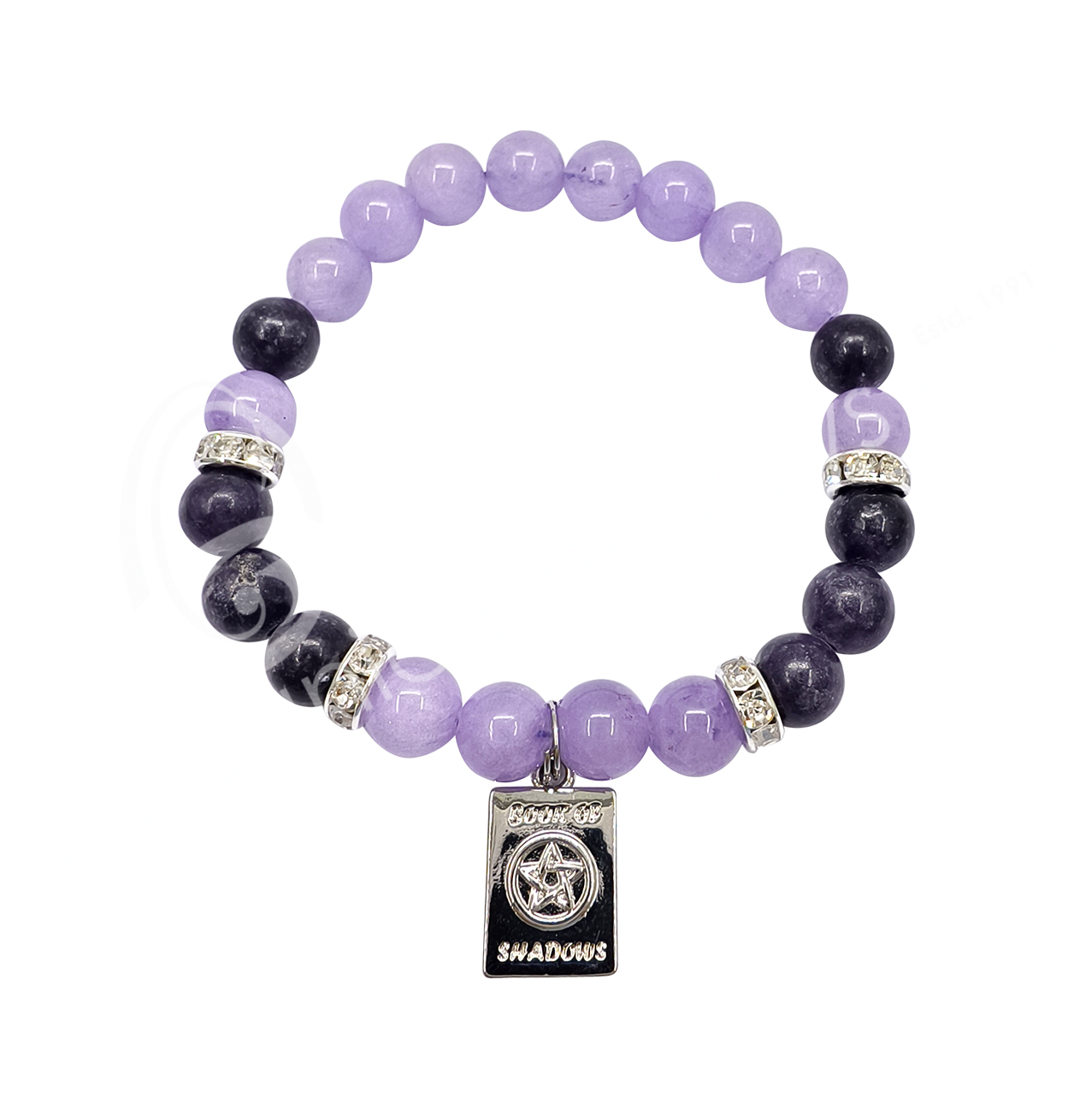 BRACELET – JADE, LAVENDER & LEPIDOLITE W/BOOK OF SHADOWS CHARM (8-8.5 MM) 7.15-7.25″