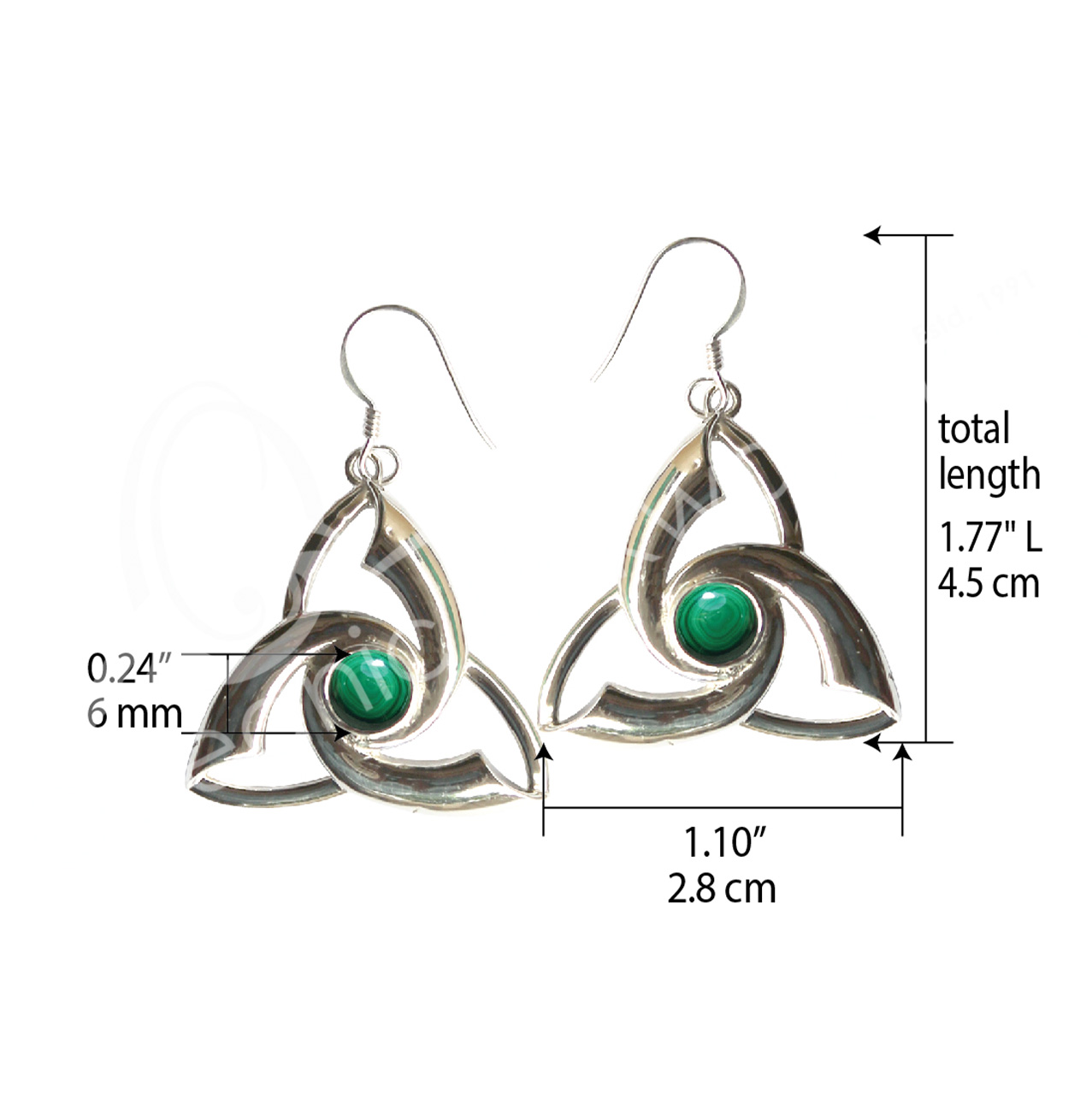 STERLING SILVER – EARRINGS TRIQUETRA MALACHITE 1″W X 1.5″L