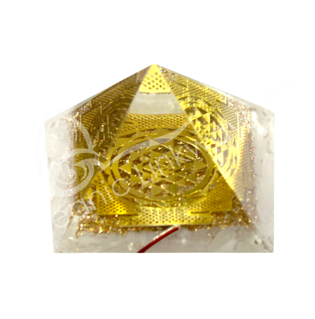 PYRAMID – SELENITE IN ORGONE W COPPER SPIRAL & SRI YANTRA 1.5″