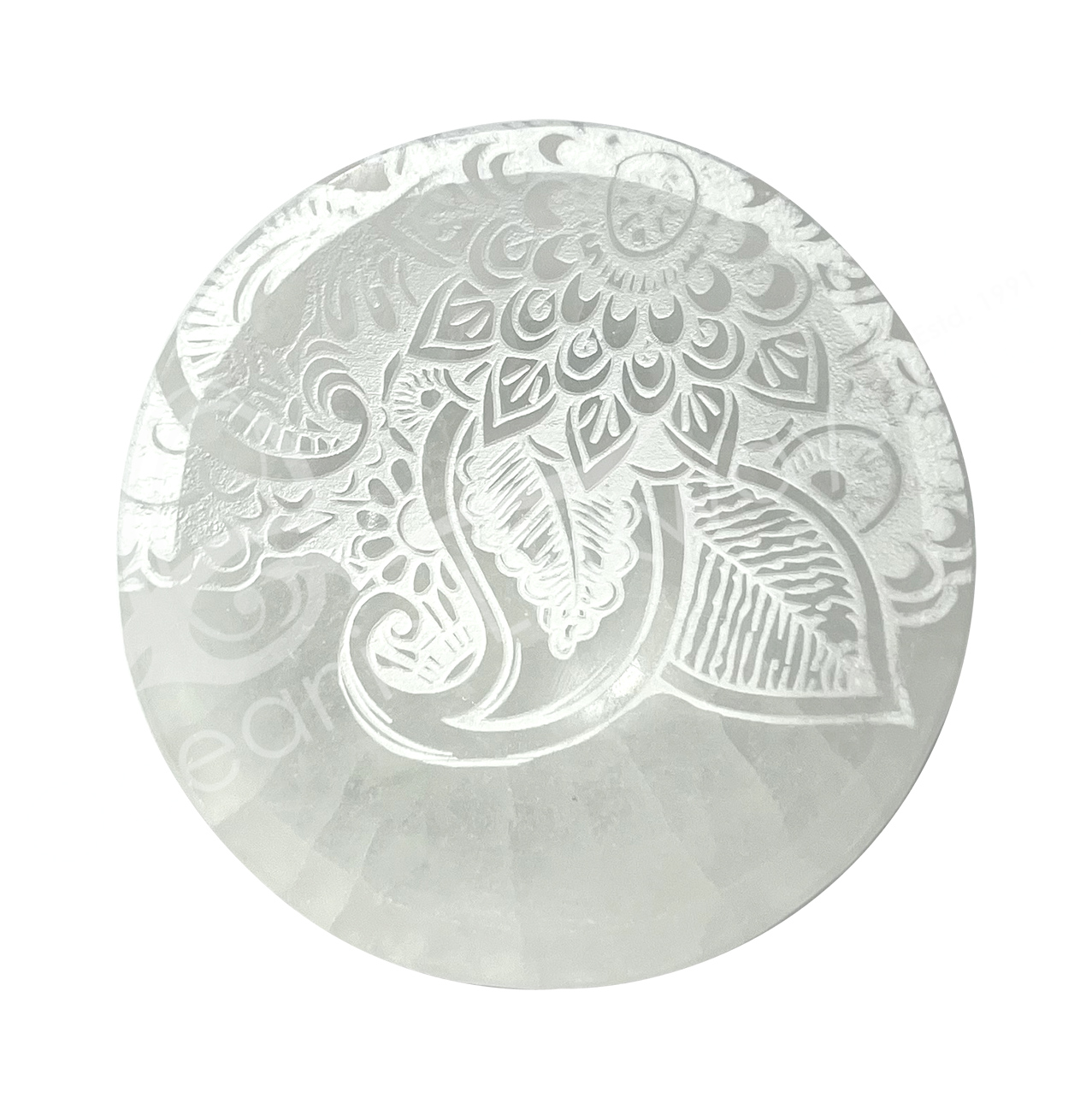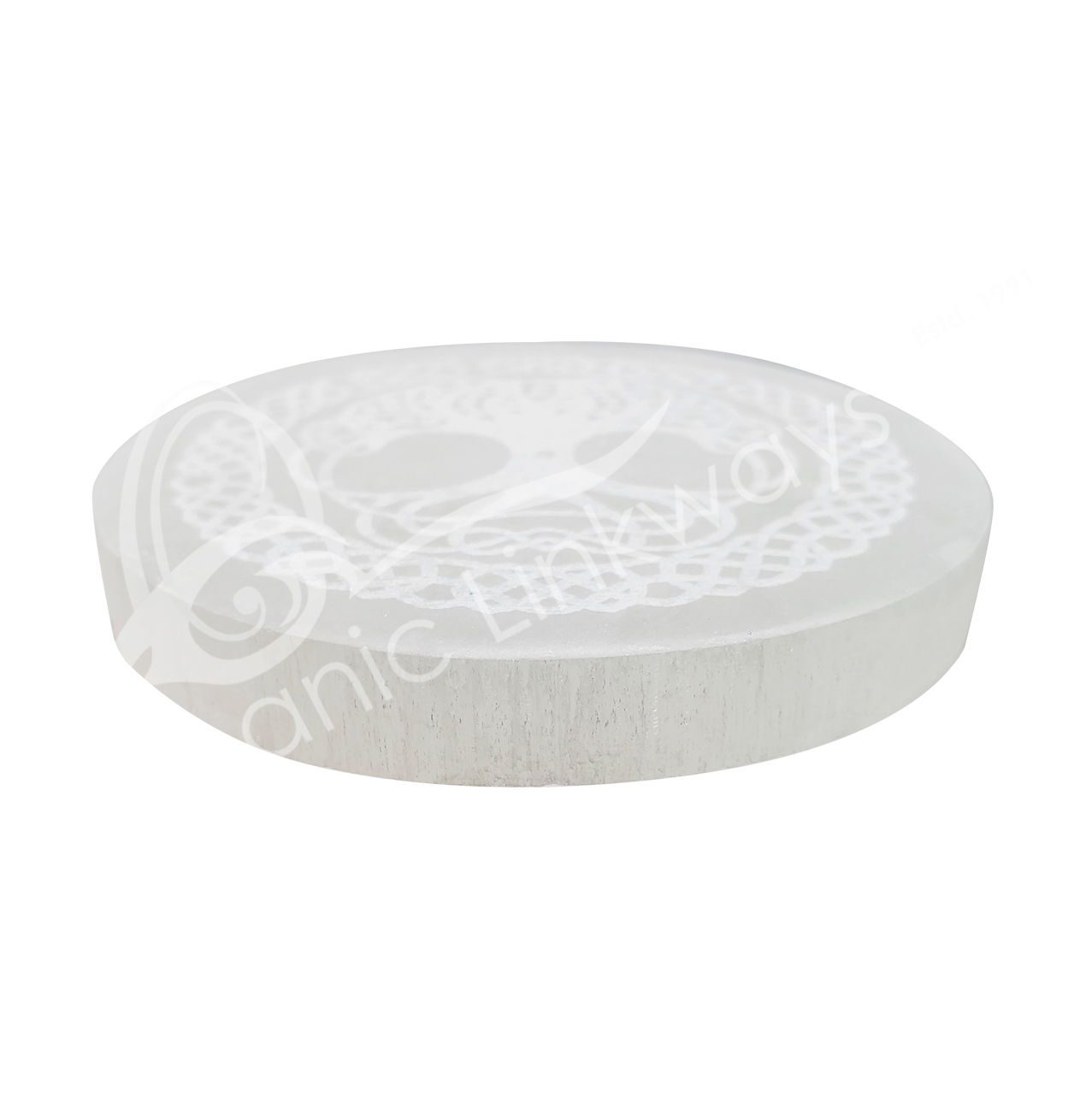 INCENSE HOLDER – SELENITE ENGRAVED FLOWER OF LIFE 4″DIA