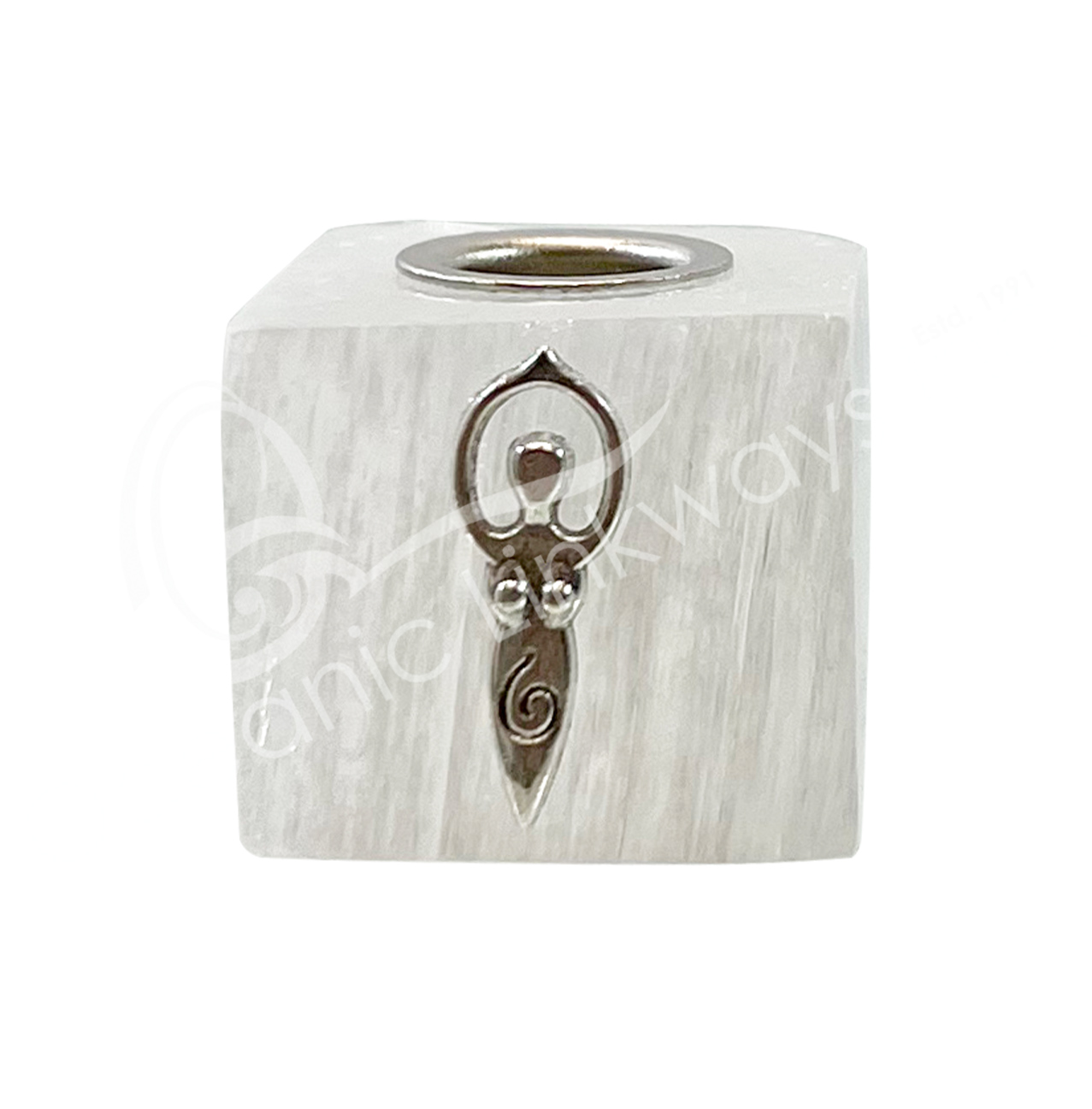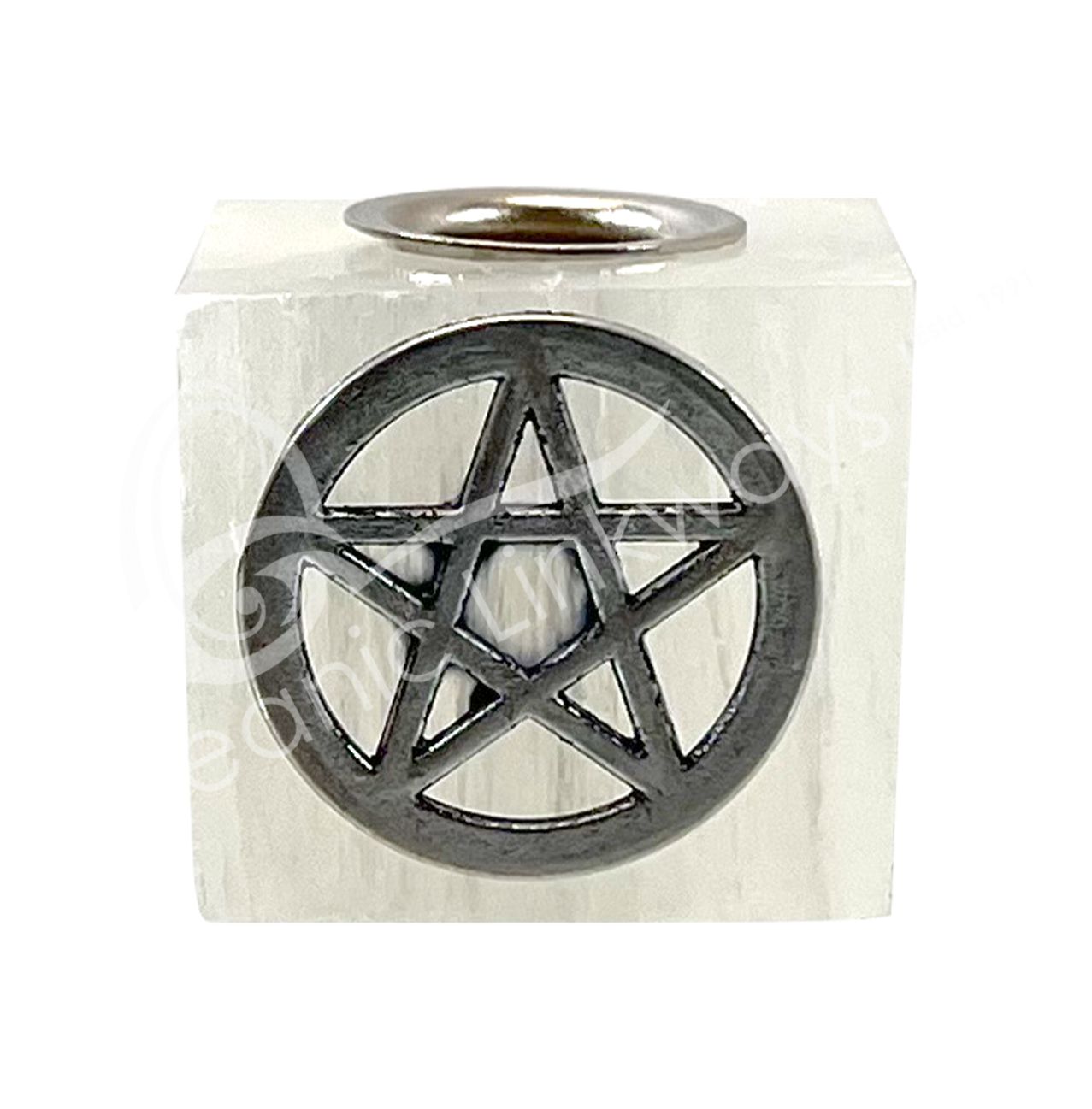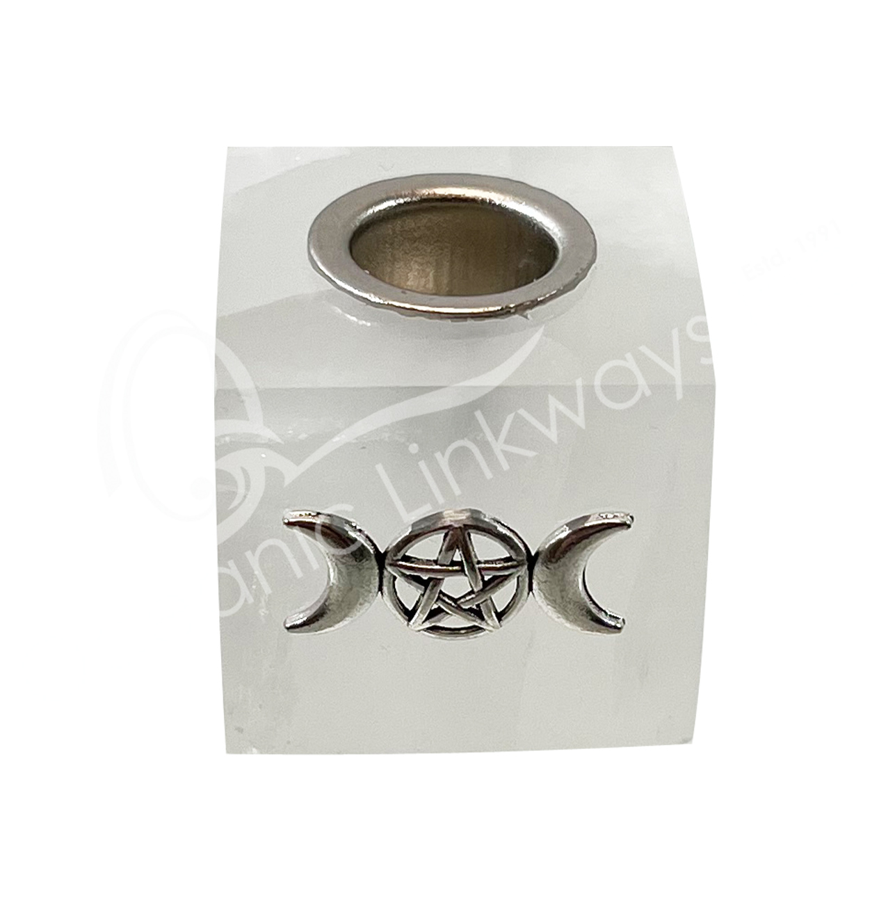 MINI CANDLE HOLDER – SELENITE CUBE WITH TRIPLE MOON PENTACLE CHARM (PK 3) 1.25″