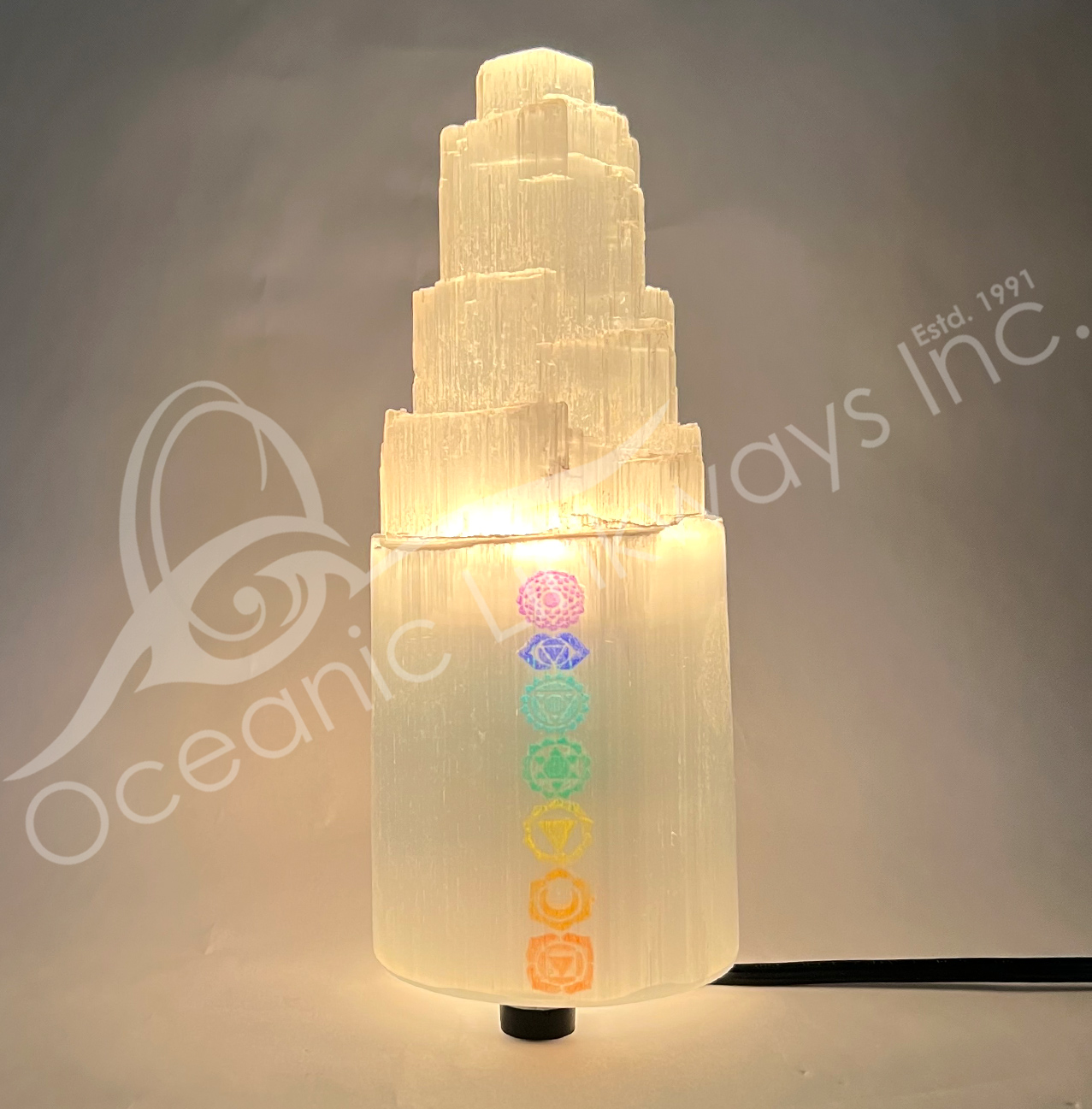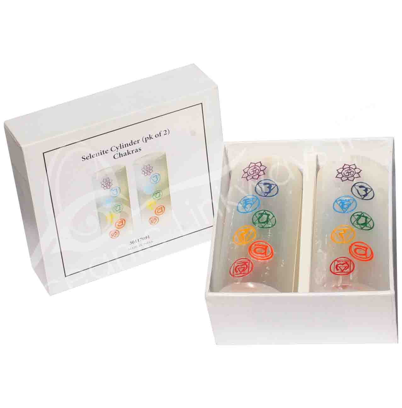 MEDITATION CHARGER CYLINDER – SELENITE ENGRAVED CHAKRA WITH COLORS (PK 2) 1.5″DIA. X 4″H