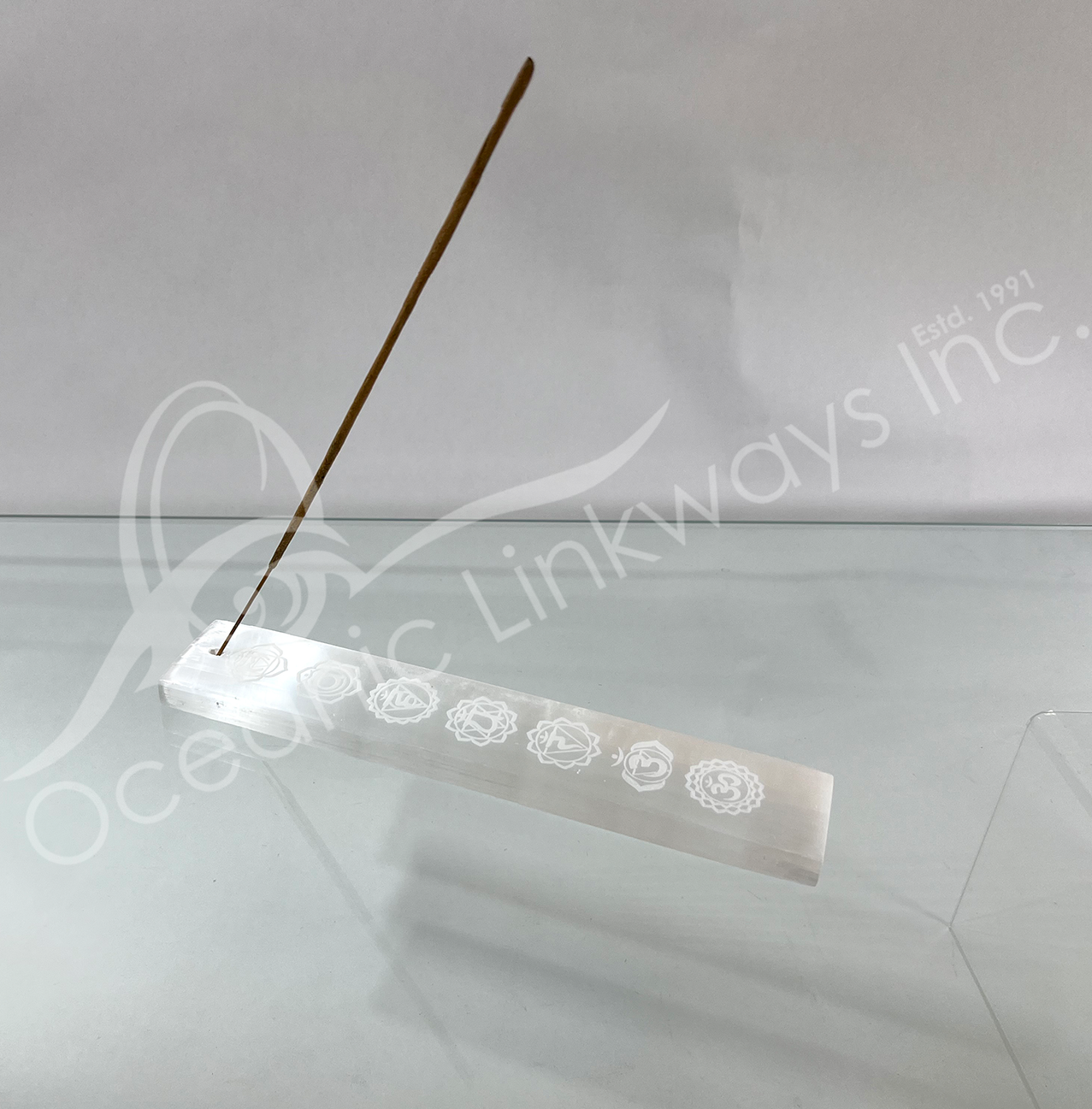 INCENSE HOLDER – SELENITE ENGRAVED FLOWER OF LIFE WITH GOLD COLOR 10″L X 1.5″W